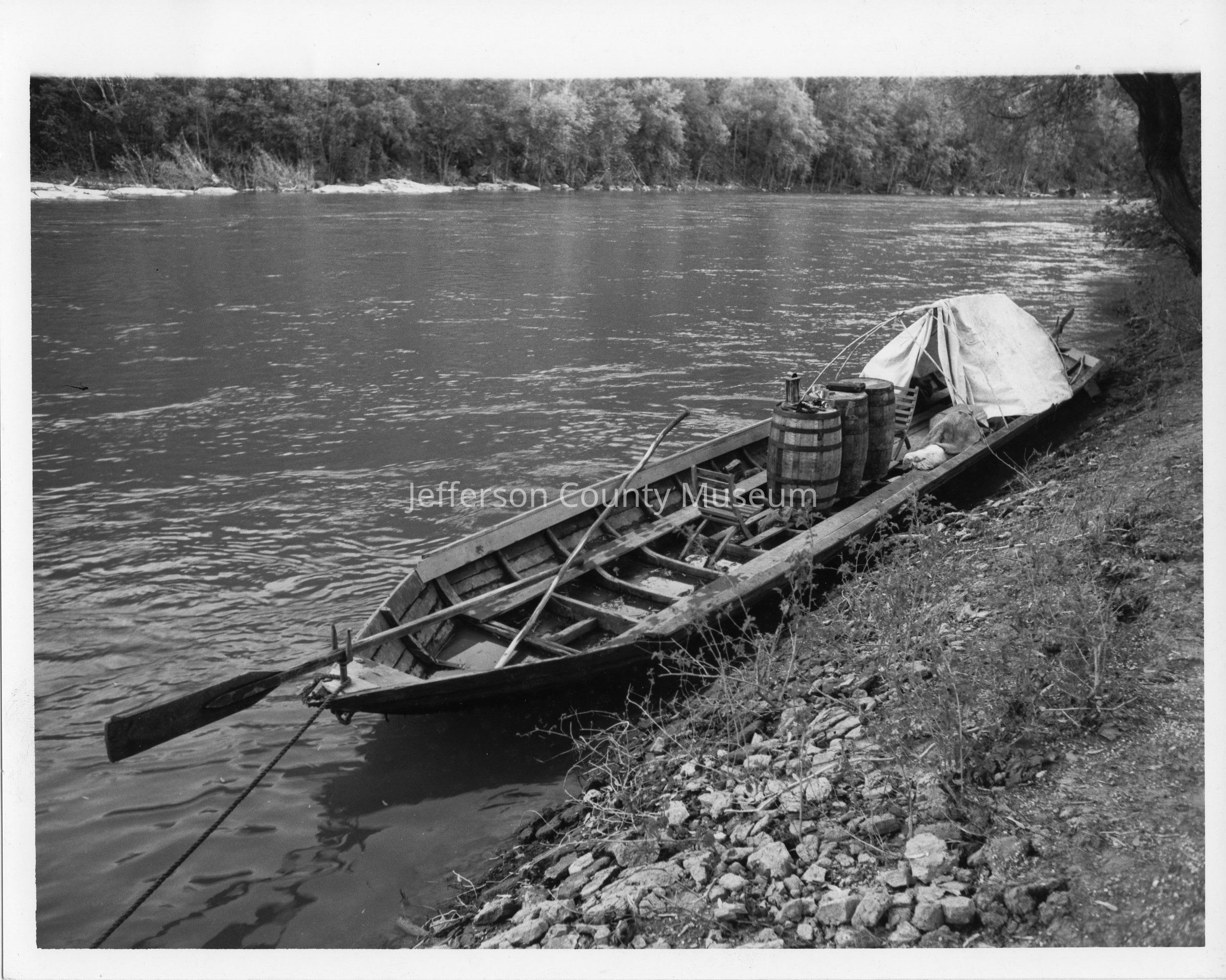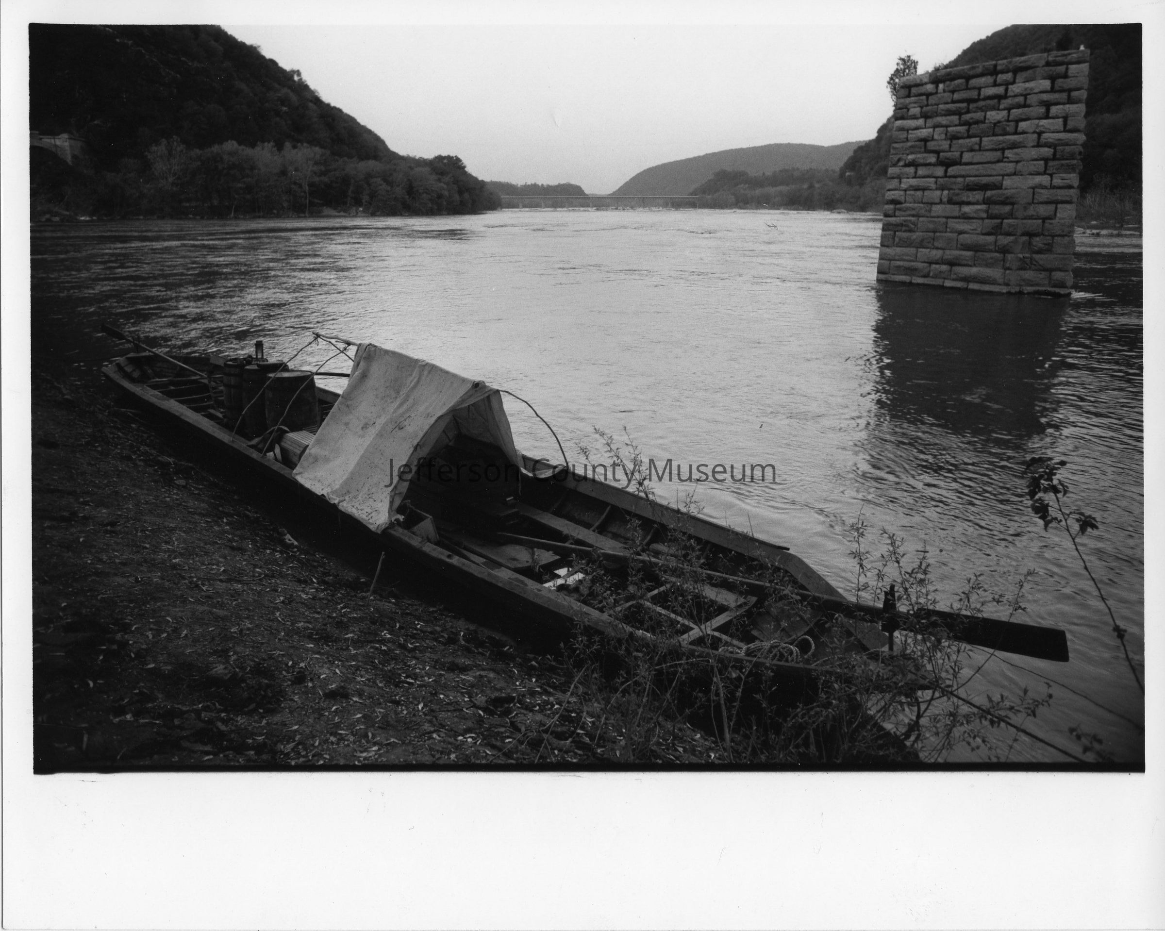 Replicas of gundalows (boats used to transport goods to Harpers Ferry from points along the Shenandoah River) at Harpers Ferry confluence of Shenandoah and Potomac Rivers circa late 1980s to early 1990s. Gundalows were used before 1830. The were obsolete with the arrival of the railroad and canal at Harpers Ferry.Acquisition