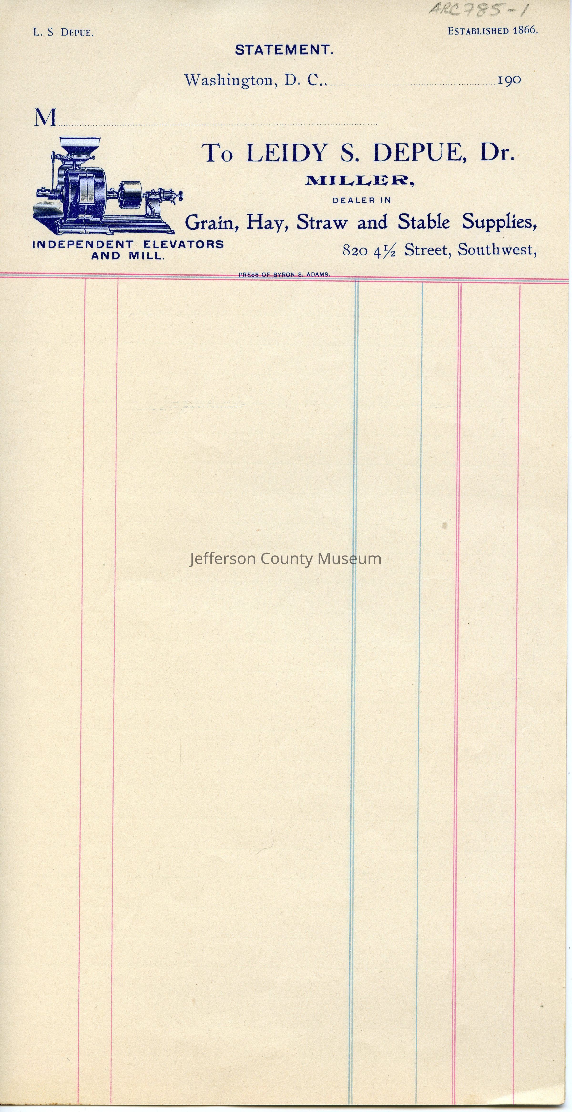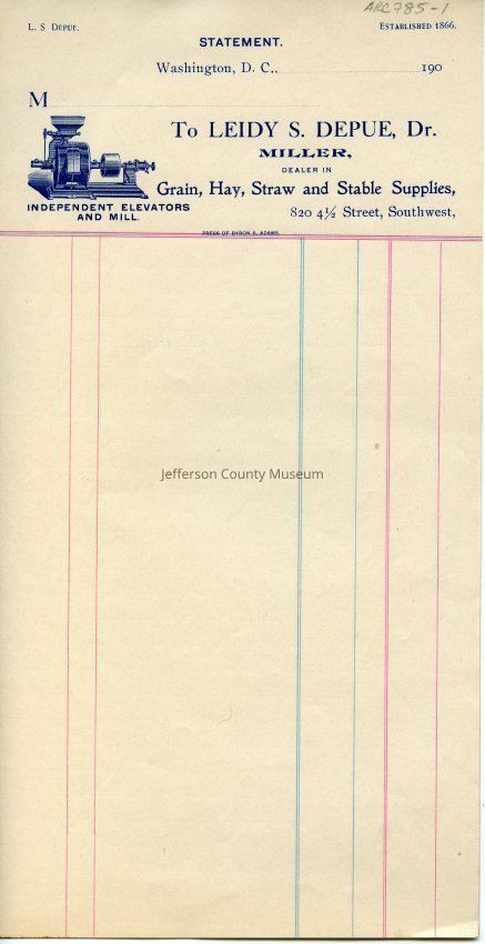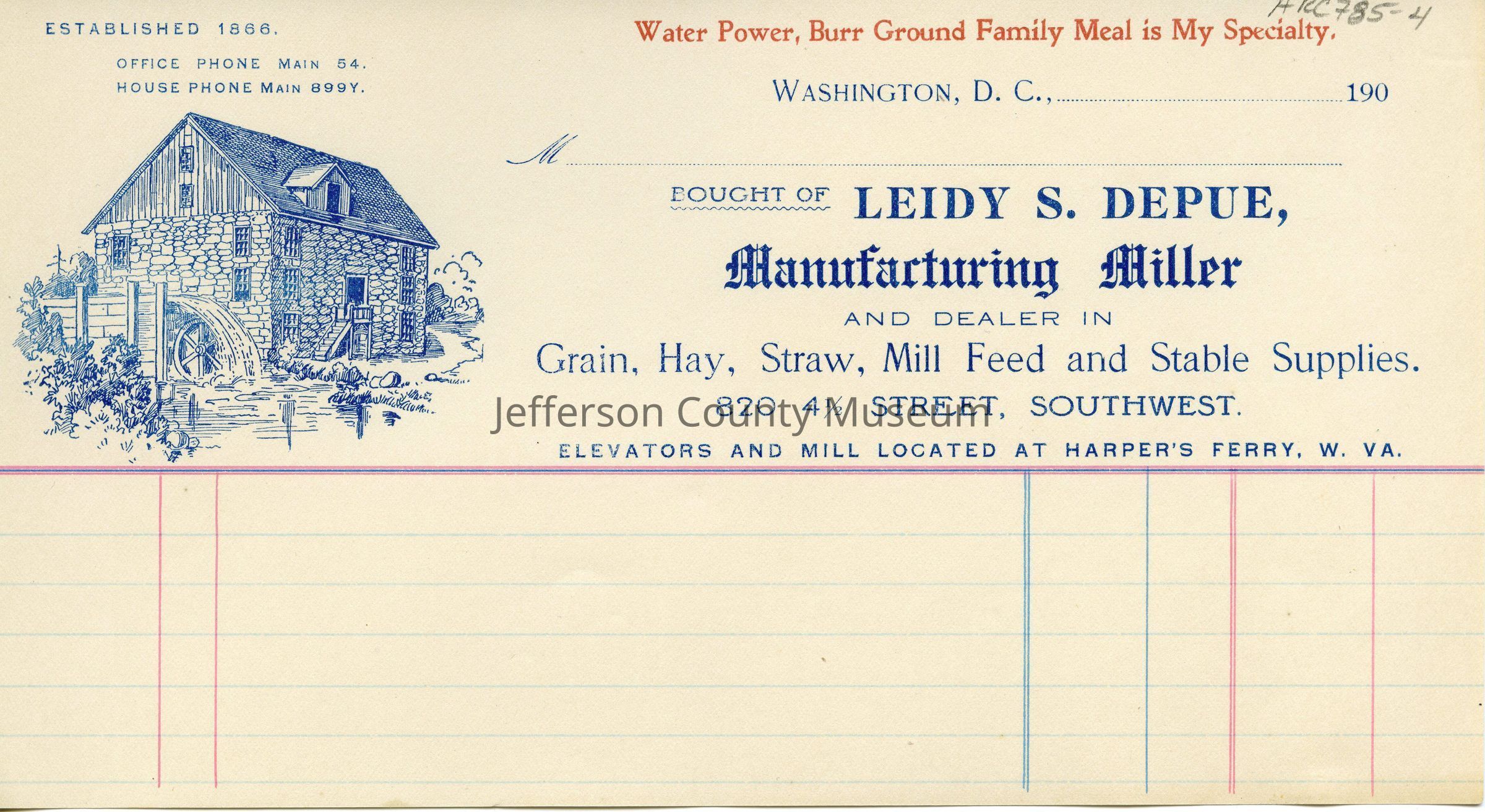 Business stationery for Leidy S. Depue, Manufacturing Miller and Dealer in Grain, Hay, Straw, Mill Feed and Stable Supplies, 820 4 1/2 Street, Southwest (Washington, DC); Elevator and Mill located at Harper's Ferry, W. VA. Business was established in 1866.