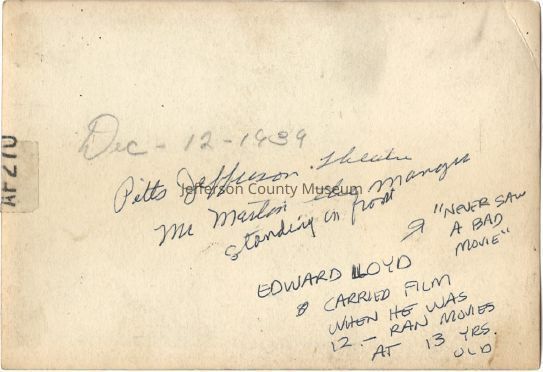 Digital image created in 2024. A note on the back says the original photo was taken in 1939. The movie advertised is from 1932.