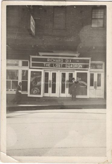 Black and white digital image of the Opera House building in Charles Town when it was used as a movie theater. Marquee says "RICHARD DIX in THE LOST SQUADRON." A note on the back of the original photograph states that the movie theater's manager is standing in front of the building.Photograph Details