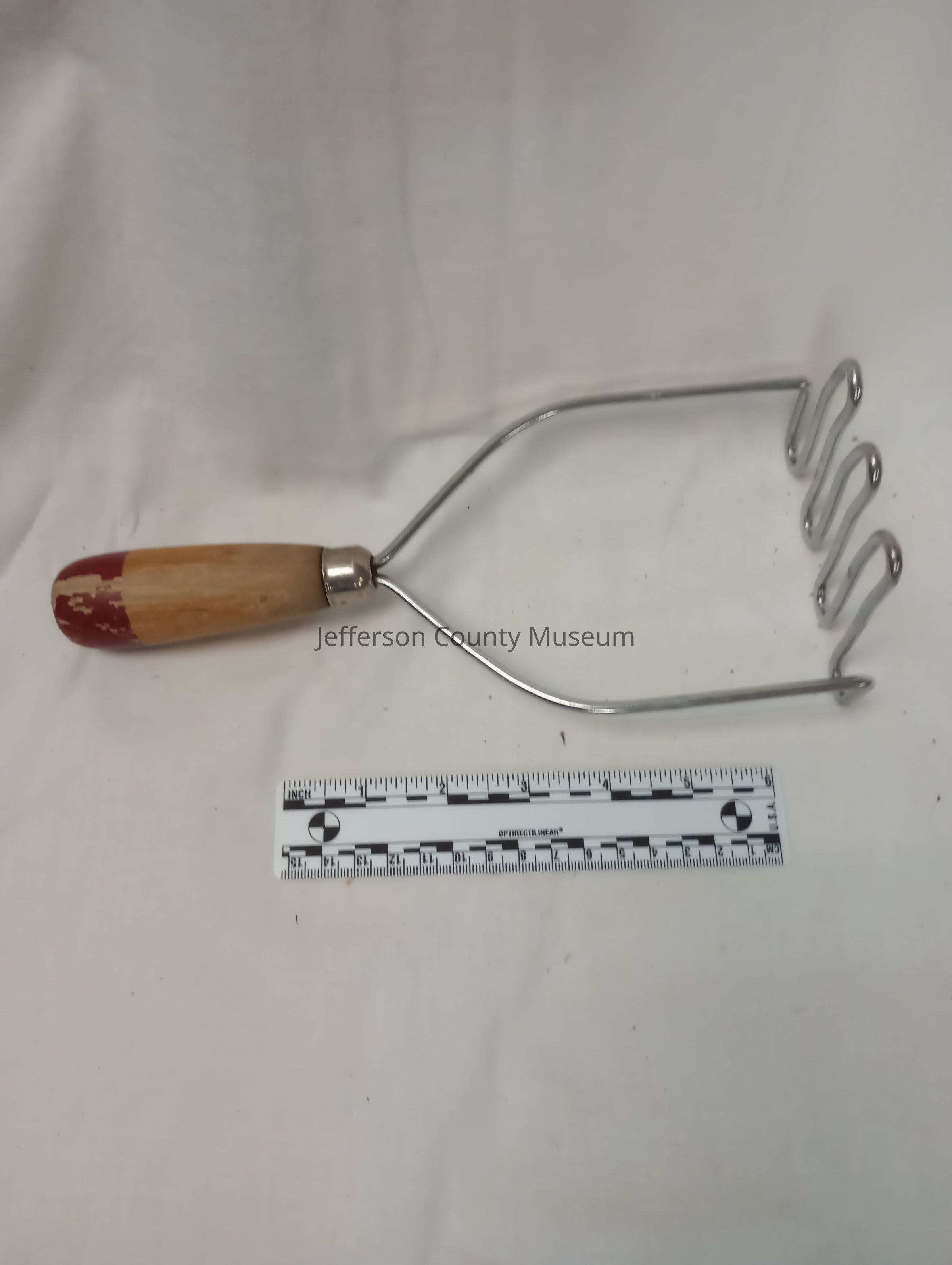 Stainless steel potato masher with wooden handle. Bottom of handle is painted red.
