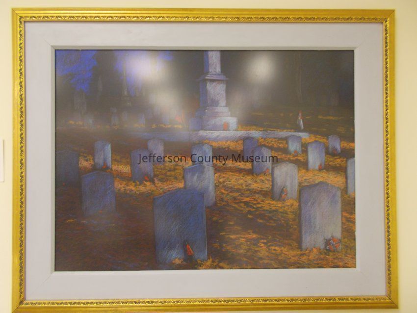 Pastel by Diana Suttenfield in gold frame with gray wood border showing Confederate burials at Elmwood Cemetery in Shepherdstown, West Virginia.Acquisition