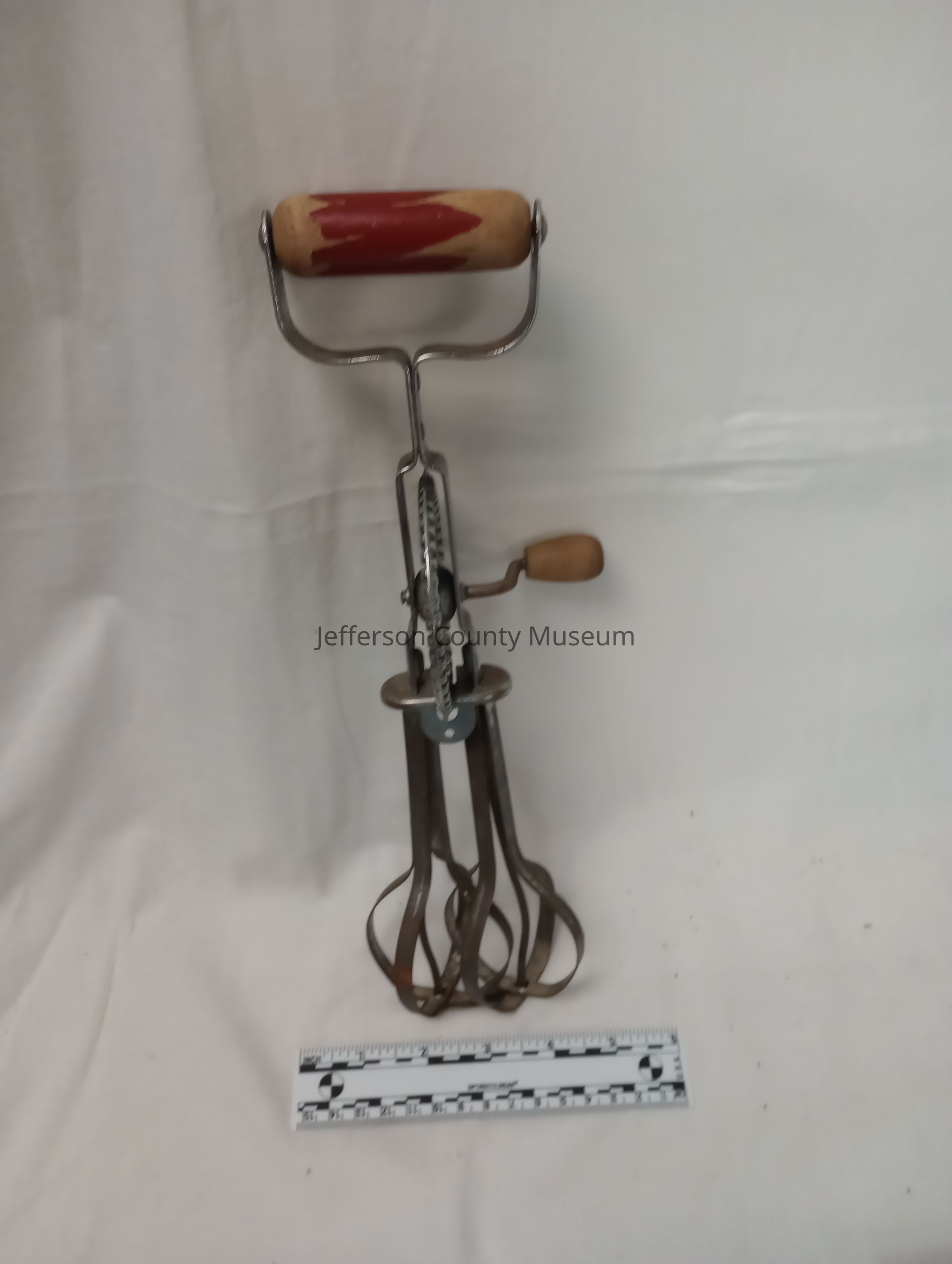 Metal egg beater with wooden handle and crank. Wooden handle has flaking red paint. Engraved on shaft of beater is "PAT APLD. FOR HIGH SPEED BEATER." Engraved along circle piece is "A & J, EKCO PRODUCTS COMPANY, CHICAGO, 39, MADE IN U.S.A."Acquisition
