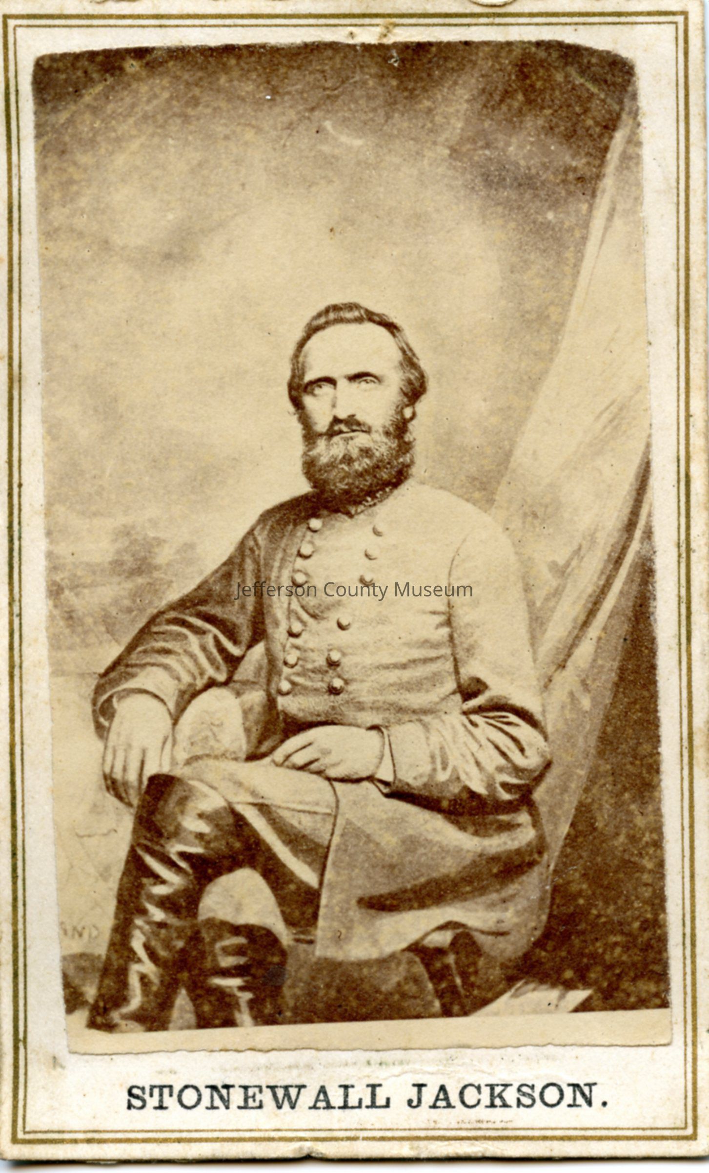 Thomas J. Jackson. He is seated in uniform with his left leg crossed over his right. No hat. At bottom STONEWALL JACKSON. On back THE MONUMENTAL Photograph Company, 178 W. Balto. St. BALTIMORE MD.Acquisition