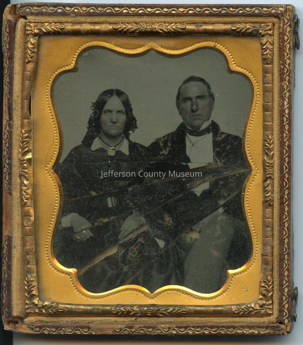 Phoebe LaRue and James Grantham seated beside one another. In a leather frame with gold colored metal surrounding the picture. Half of the frame is missing and the glass of the ambrotype is broken. Two small hooks for closing are on the right side.
