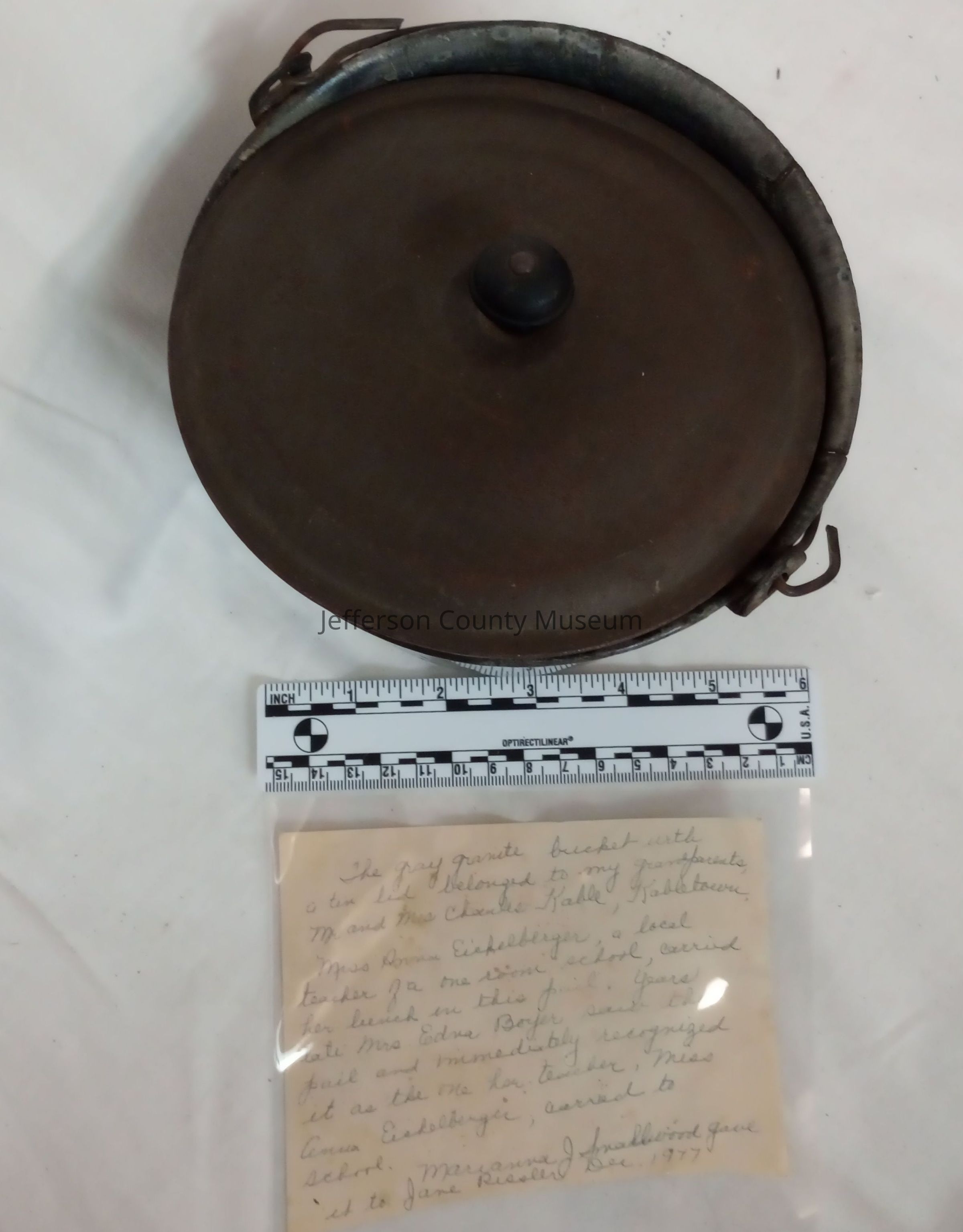 Note with pail: "The gray granite bucket with a tin lid belonged to my grandparents, Mr. and Mrs. Charles Kable, Kabletown. Miss Anna Eickelberger, a local teacher of a one-room school, carried her lunch in this pail. Years later Mrs. Edna Boyer saw this pail and immediately recognized it as the one her teacher, Miss Anna Eickelberger, carried to school. Marianna J. Smallwood gave it to Jane Rissler Dec. 1977."Acquisition