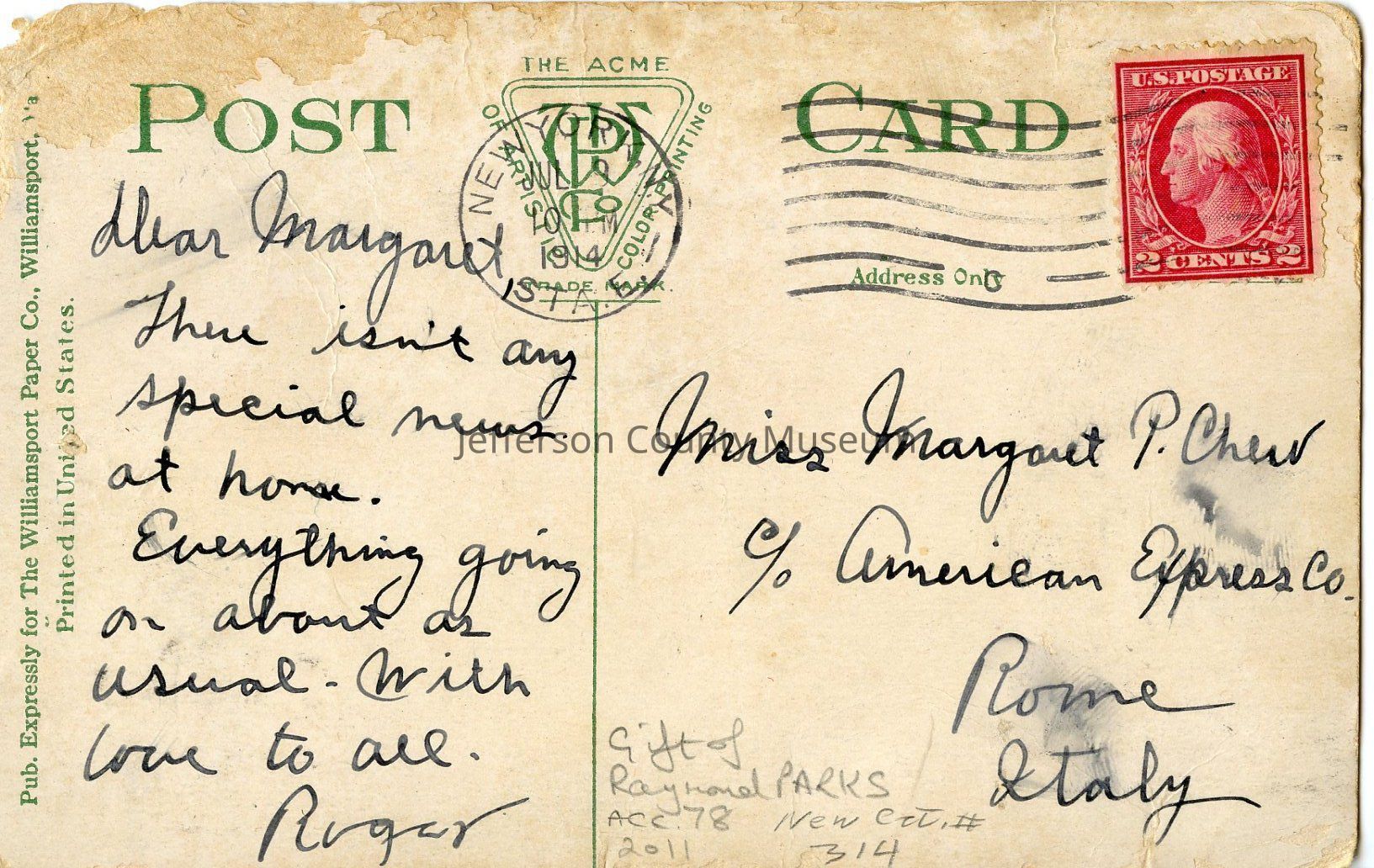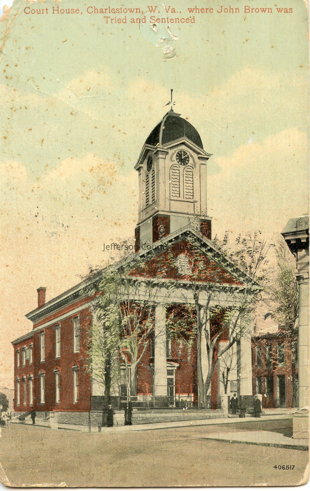 Jefferson County Court House. At top on front: Court House, Charlestown, W. Va., where John Brown was Tried and Sentenced. Card is addressed to: Miss Margaret P. Chew c/o American Express Co. Rome, Italy. Has red and white 2 cent stamp with an image of George Washington. Signed by: RogerAcquisition