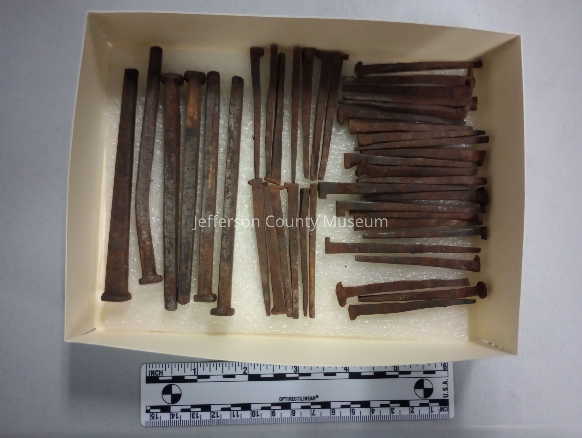 Wrought iron nails from Lloyd K. Hoffman's grandfather's (David Hoffman's) house three miles below Shepherdstown along Rattlesnake Run. House was built by David Hoffman's father (John Hoffman) ca. 1780.