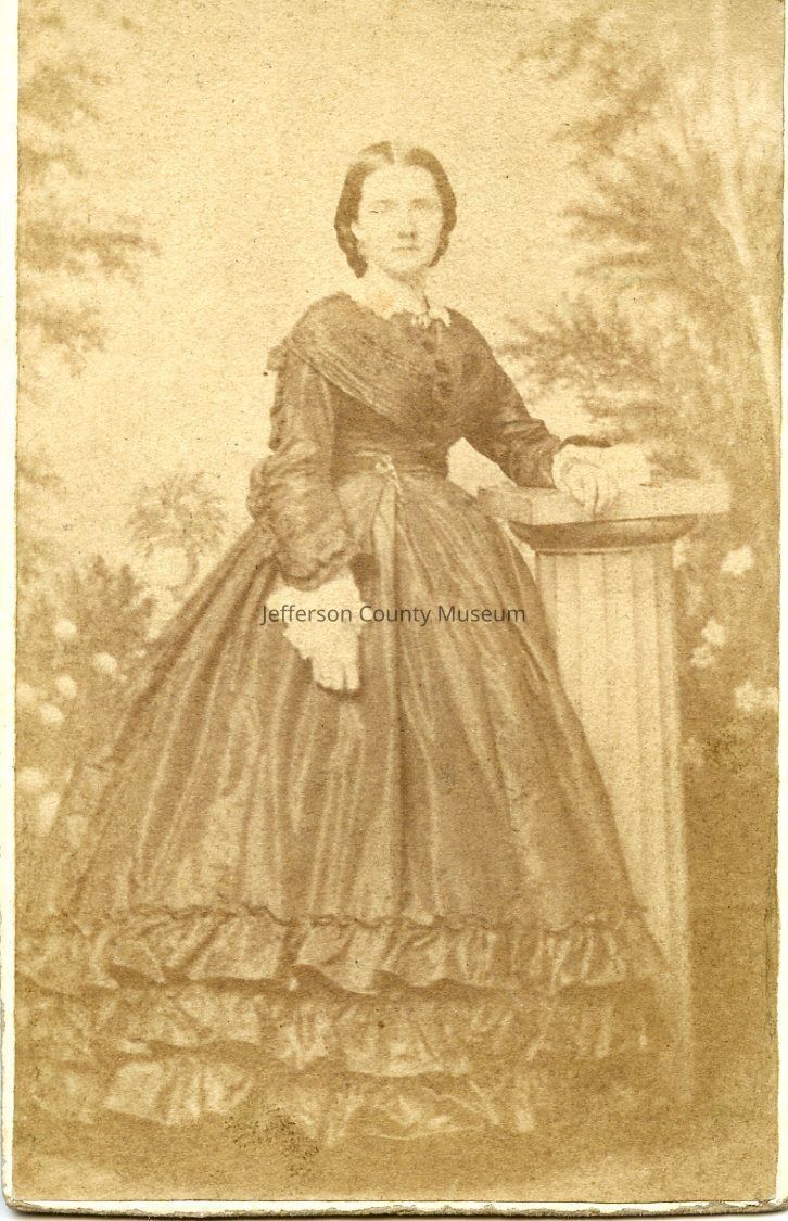 Laura Hall standing in a long black dress with white cuffs. Her left arm is resting on a pedestal. Written on back in fading brown ink "Laura Hall July 1862"