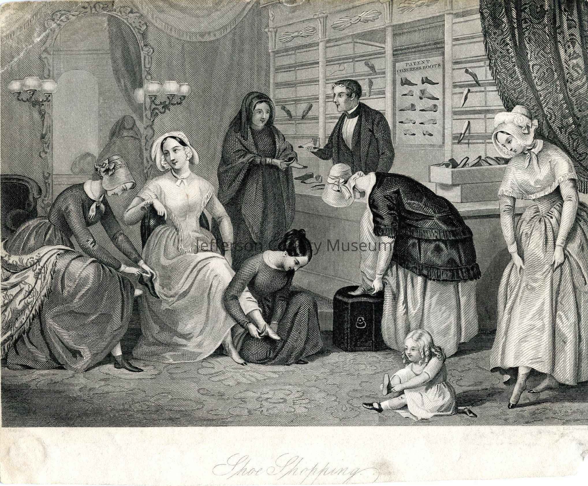 Steel engraving. Black and white Victorian. Shows 5 women and little girl trying on shoes. Man behind counter. "Shoe Shopping" in script at bottom.Acquisition