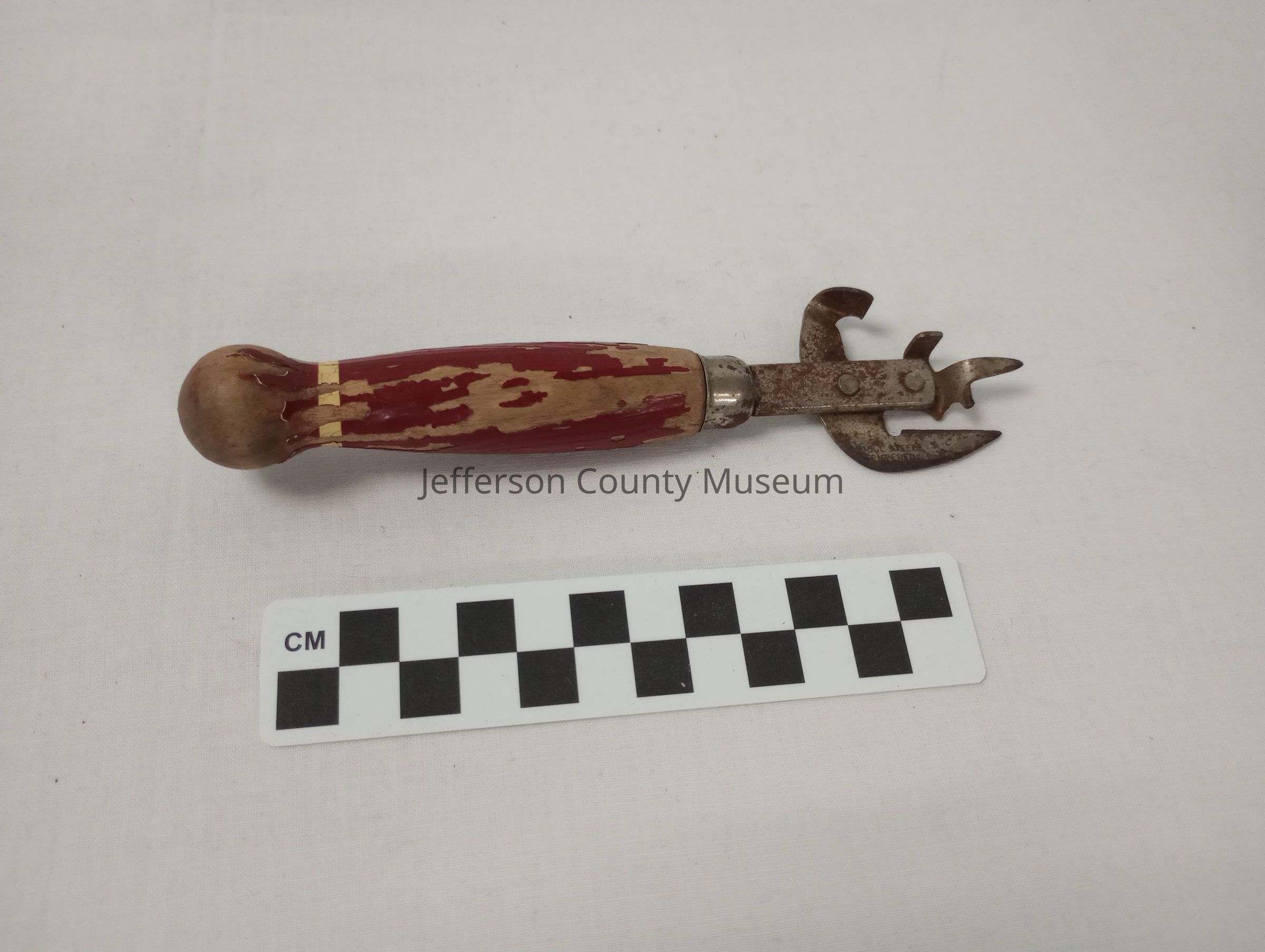 EKCO A&J can opener, metal with wooden handle. Handle has remnants of red and cream paint.