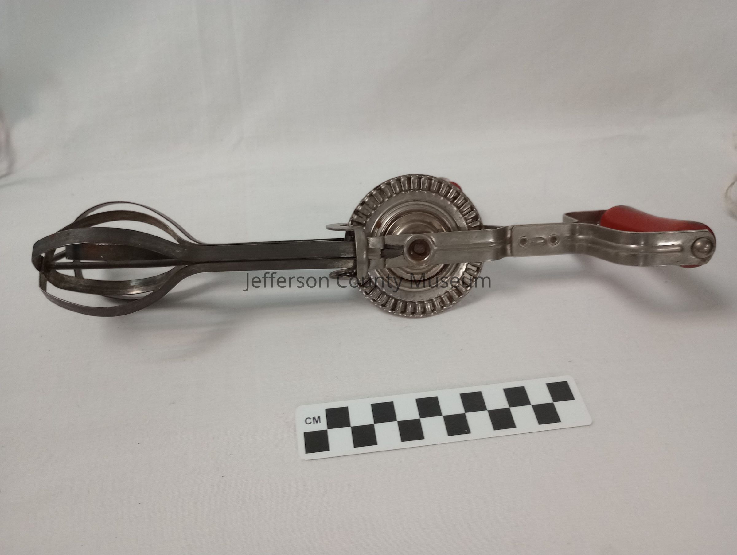 Androck metal double dasher egg beater with red wooden handles. Wheel says made in USA with patent no. 2210810.Acquisition