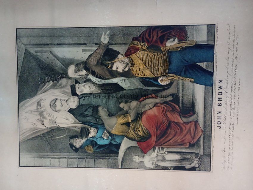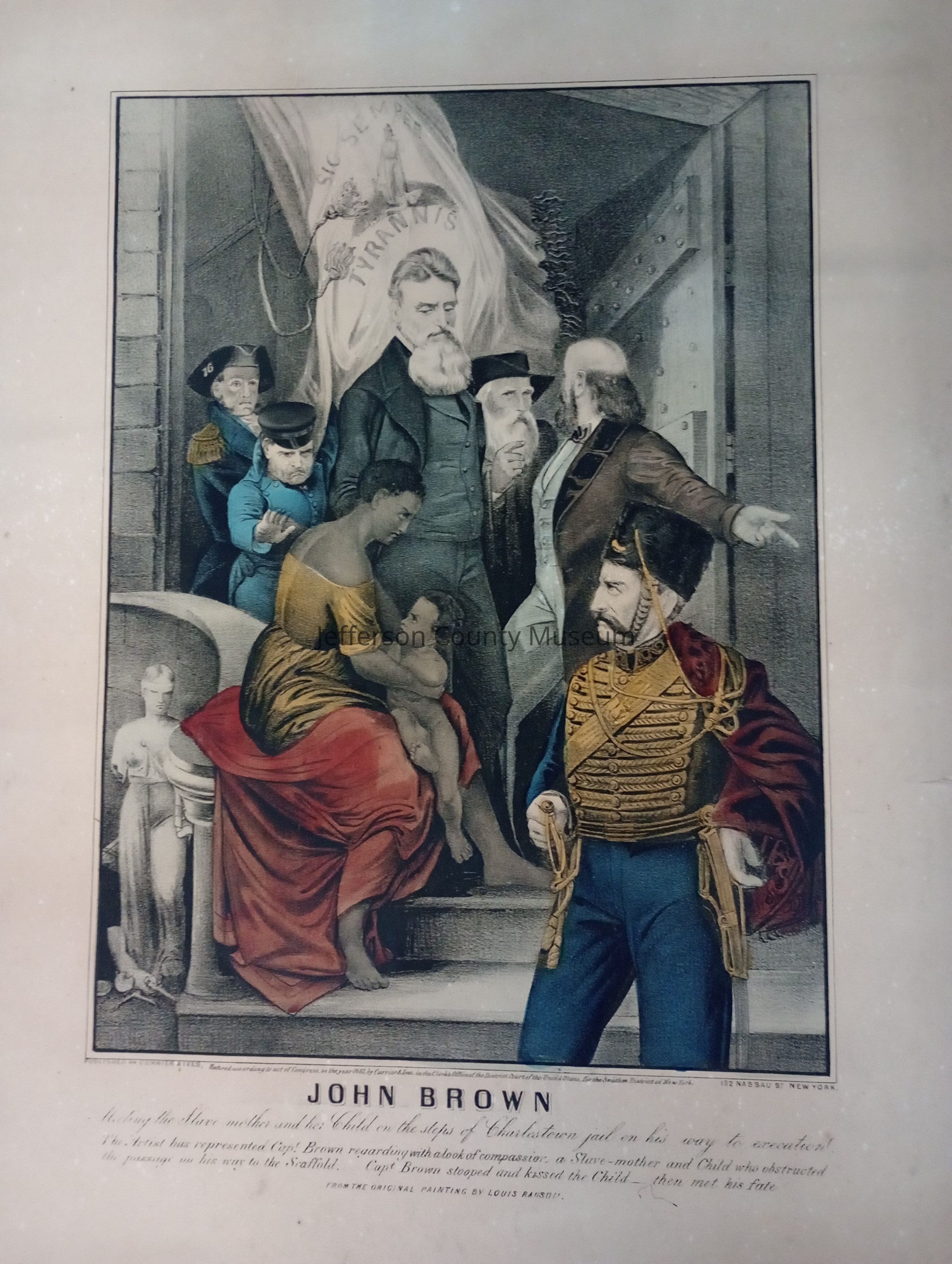 A print produced by Currier and Ives featuring John Brown walking past a "slave-mother and child" on his way to execution. Above his head flies the flag of the Commonwealth of Virginia, with the motto "Sic Semper Tyrannis." In the lower lefthand corner is blind justice, a statue whose arms are broken.Acquisition