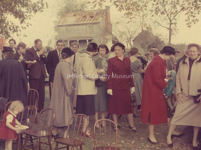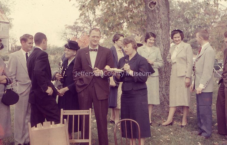 IMG3895002: Individuals standing outside Uvilla Methodist Church. A house can be seen in the background. Second from left (holding plate) is "Kitty" Merchant. Third from left is Donald Merchant. Fourth from left is William "Billy" Myers, III.