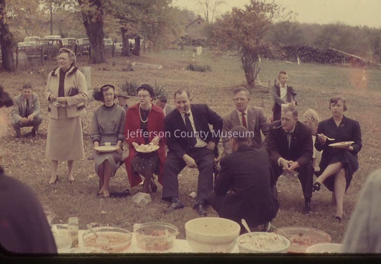 IMG3895001: Individuals standing near a tree outside Uvilla Methodist Church. Second from the left is William "Billy" Myers, III. Fourth from the left is Donald Merchant. Fifth from the left (holding plate) is "Kitty" Merchant.