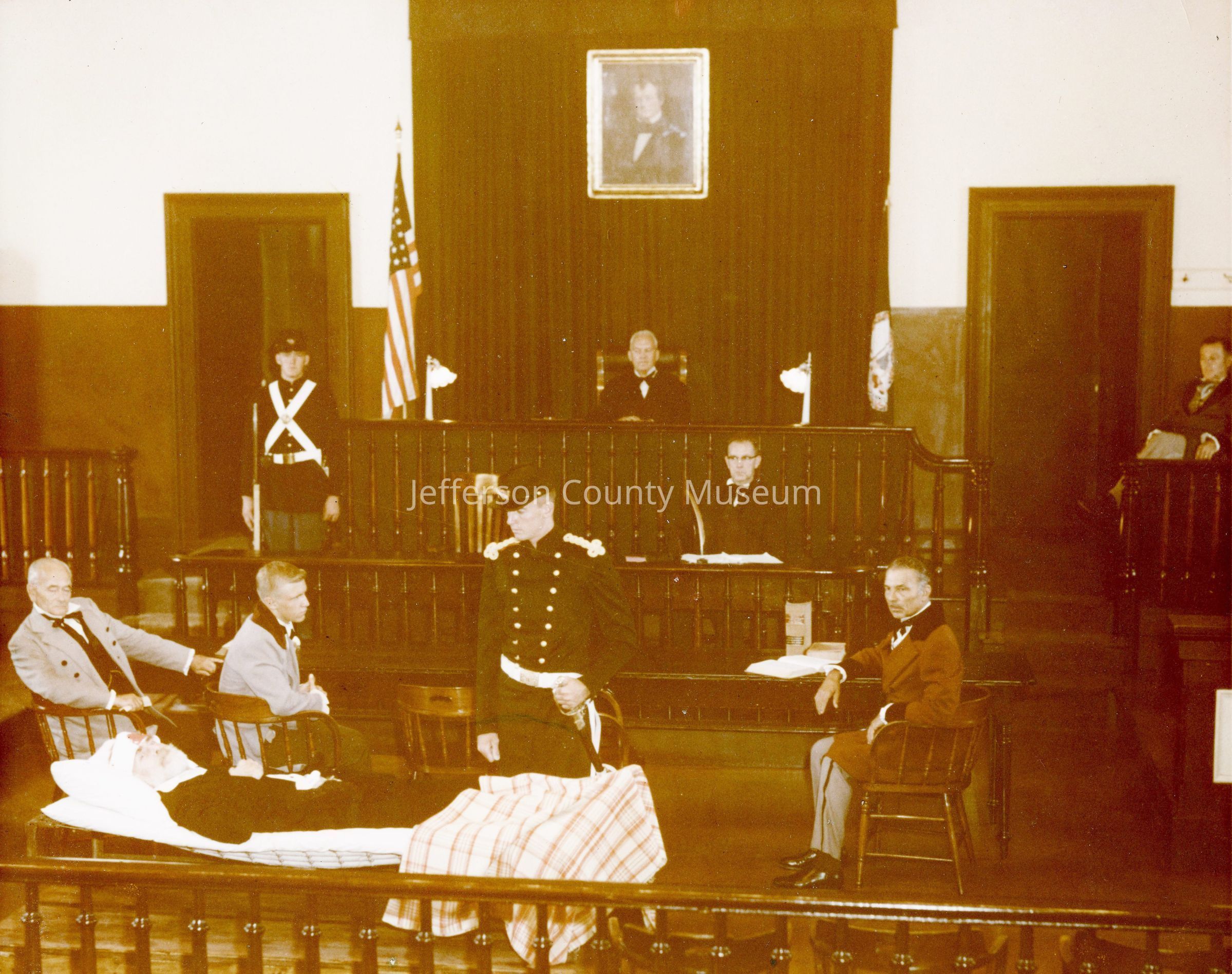 Lying on cot: John Brown (Robert Leonard); standing next to Brown Captain Sinn (Glenn Ramsburg).