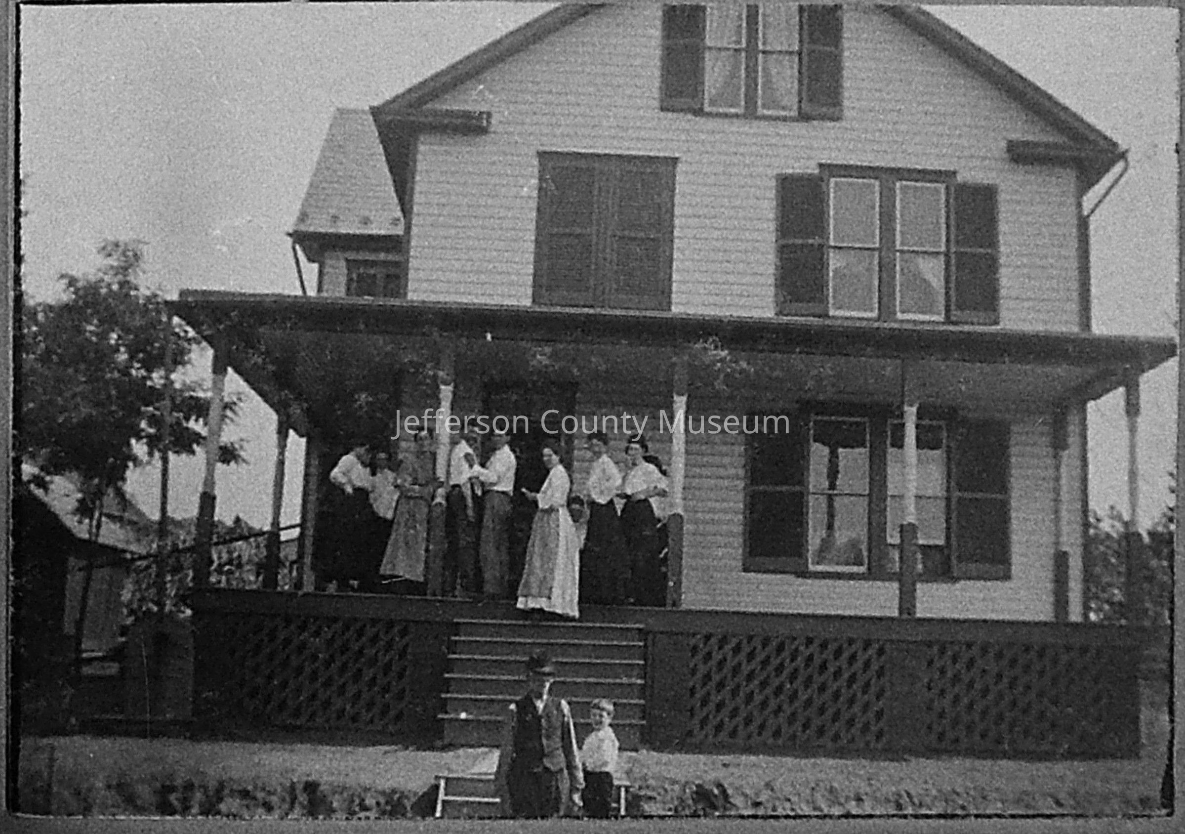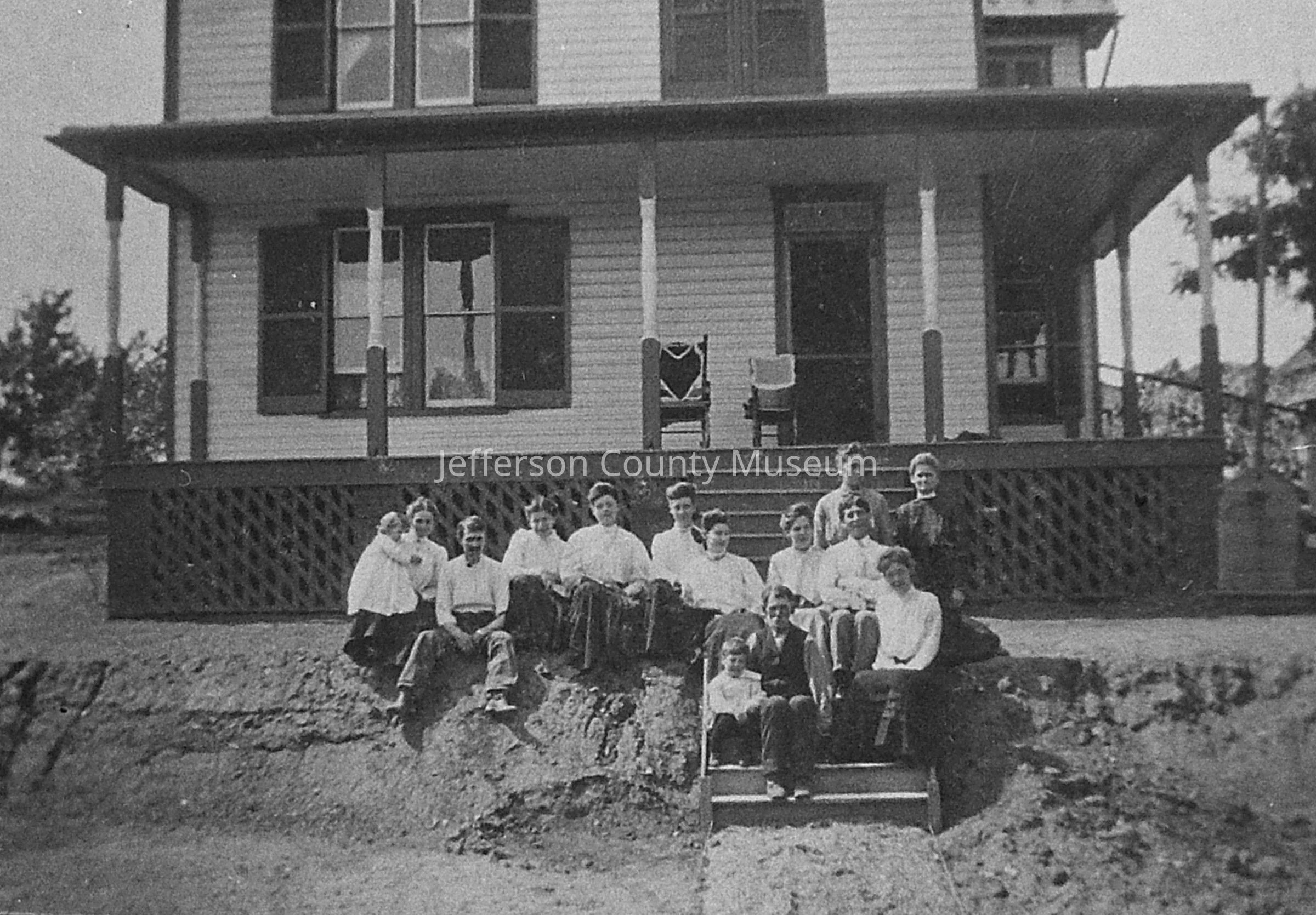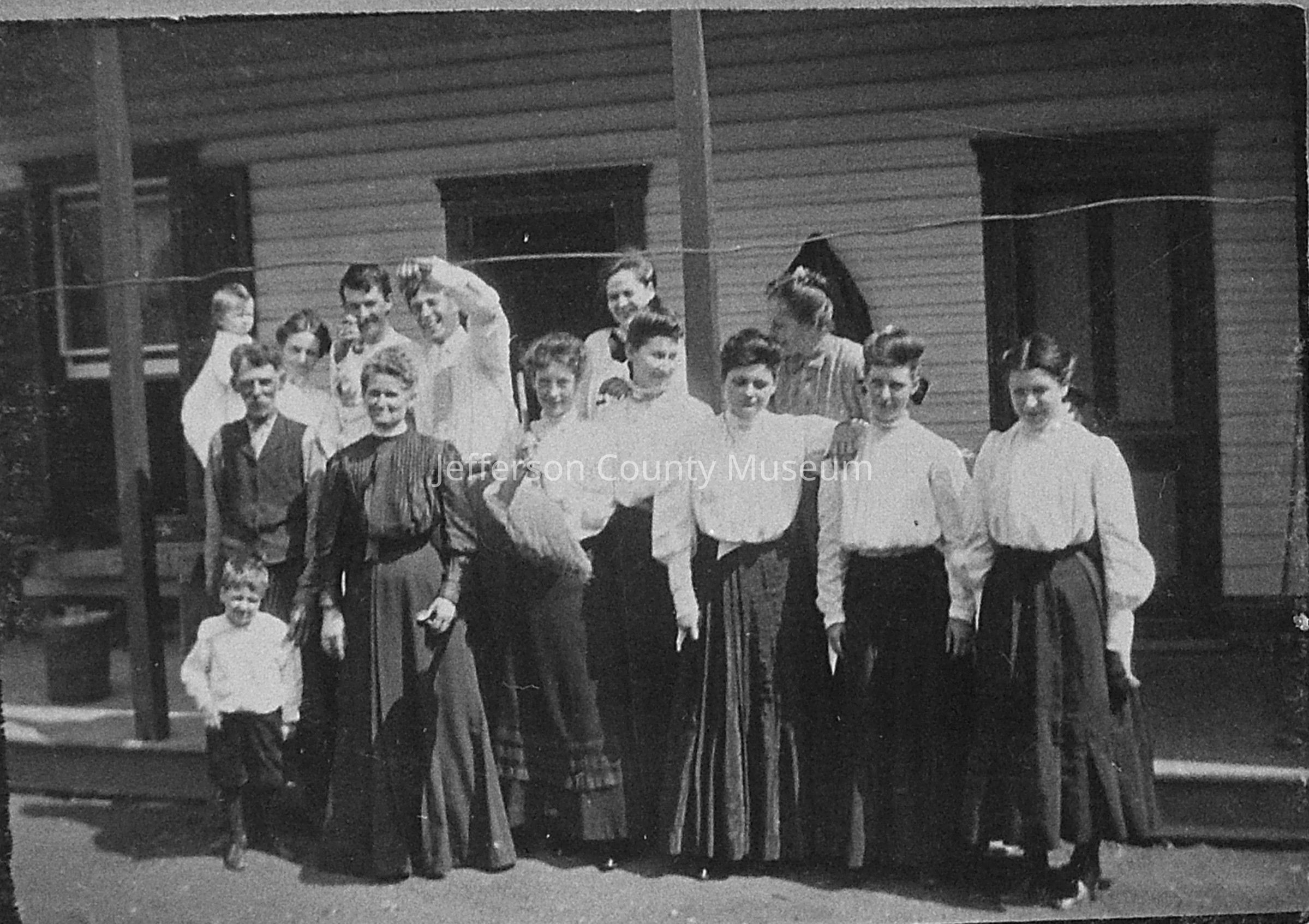 James T. and Annie Merchant, their family, and unidentified young women in front of house (possibly James and Annie Merchant's house in Zoar).