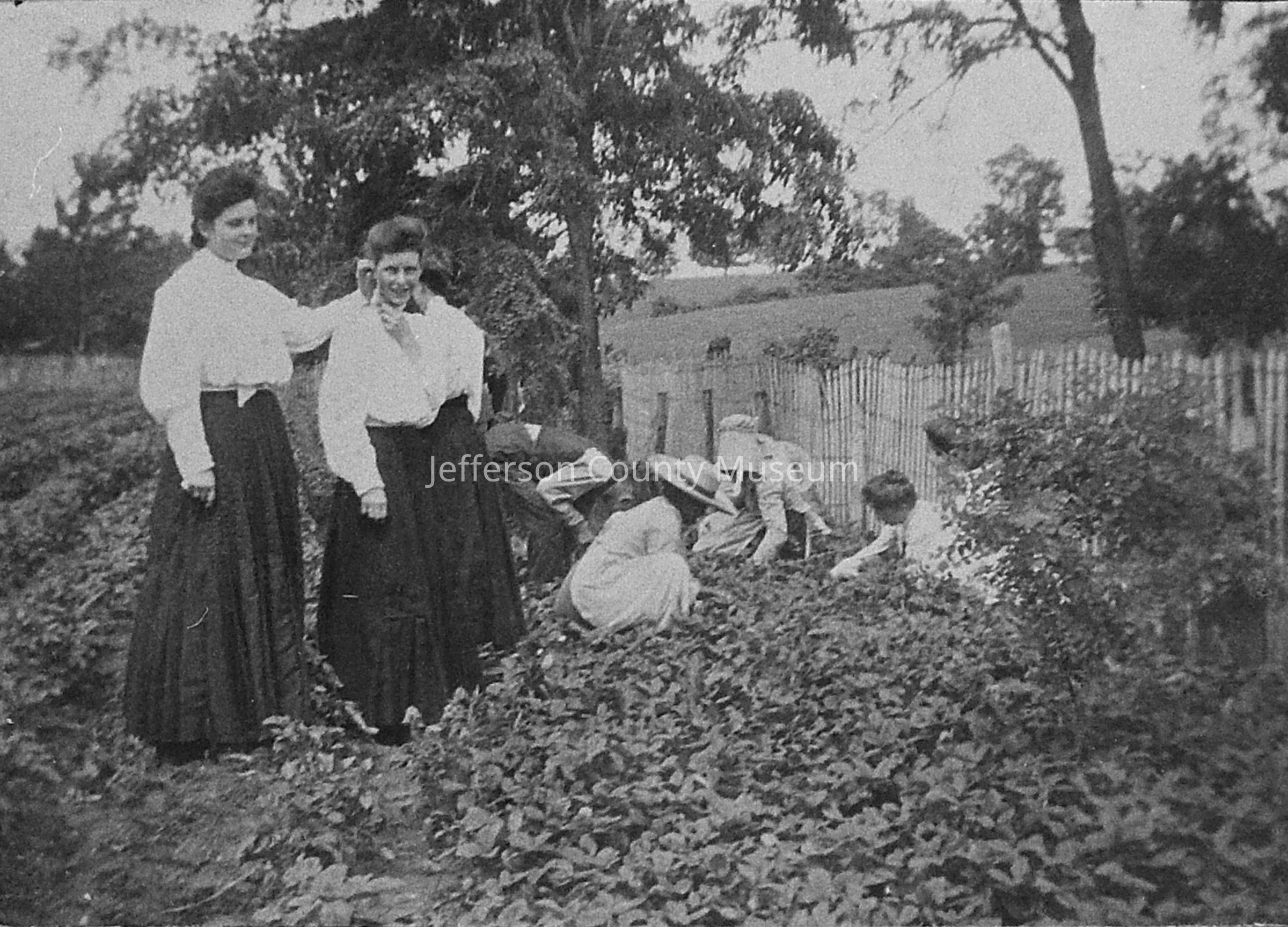 IMG3900004: Young women working in garden near house. James T. Merchant crouching in middle of photograph.Acquisition