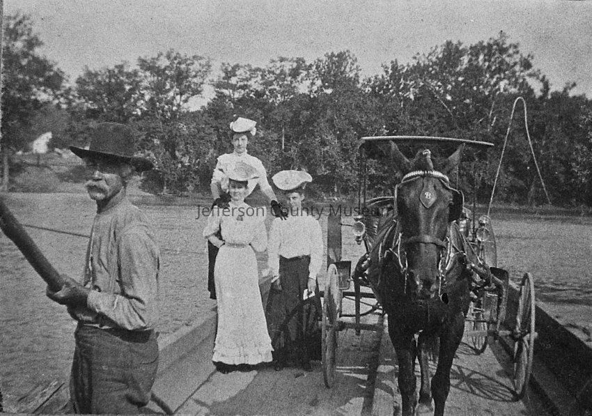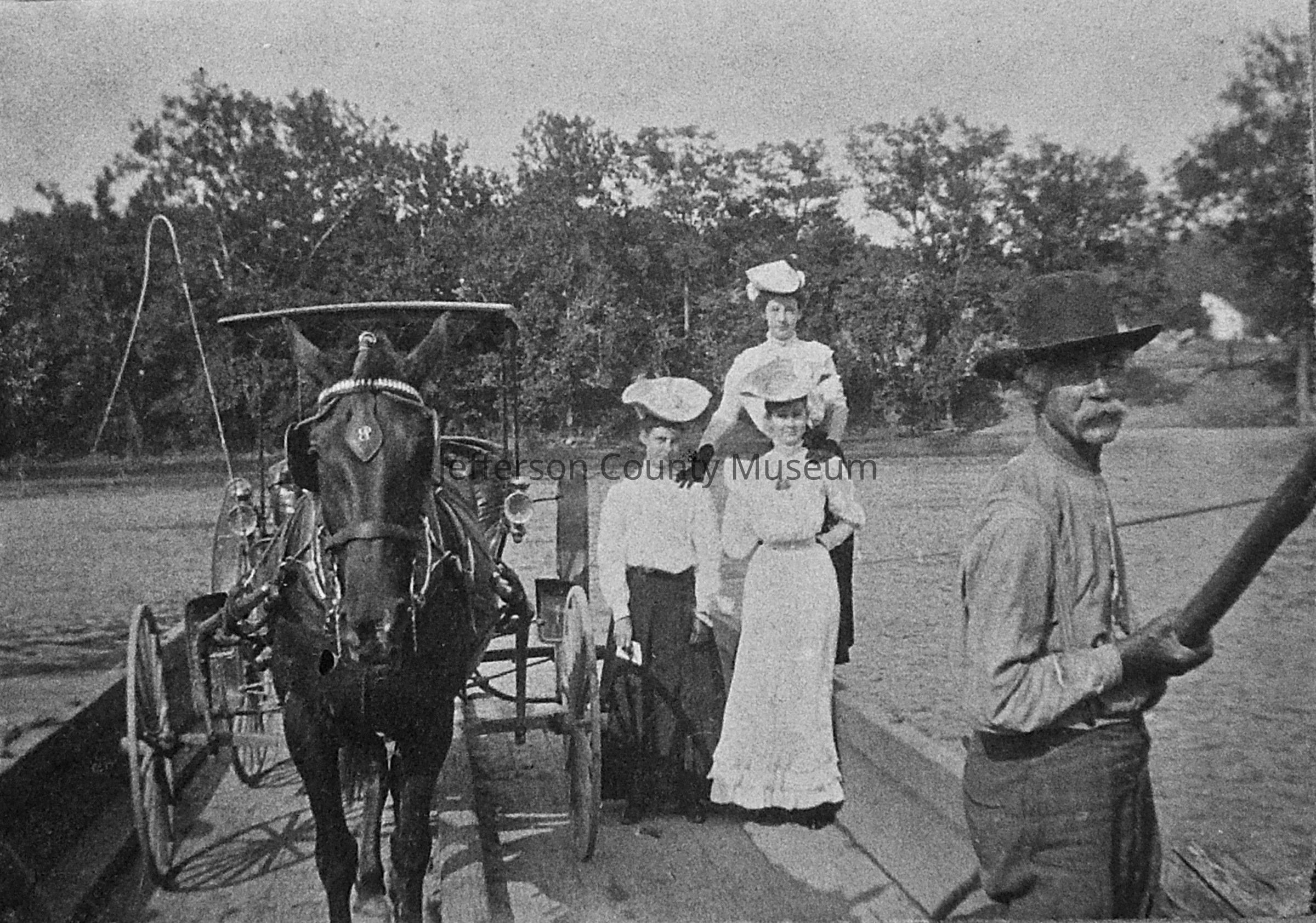 Ferry operator, known as Mr. Grey, and three women (possibly Bessie Merchant standing on side of the boat), and a horse and carriage along a ferry at the Bloomery on Route 9.Acquisition