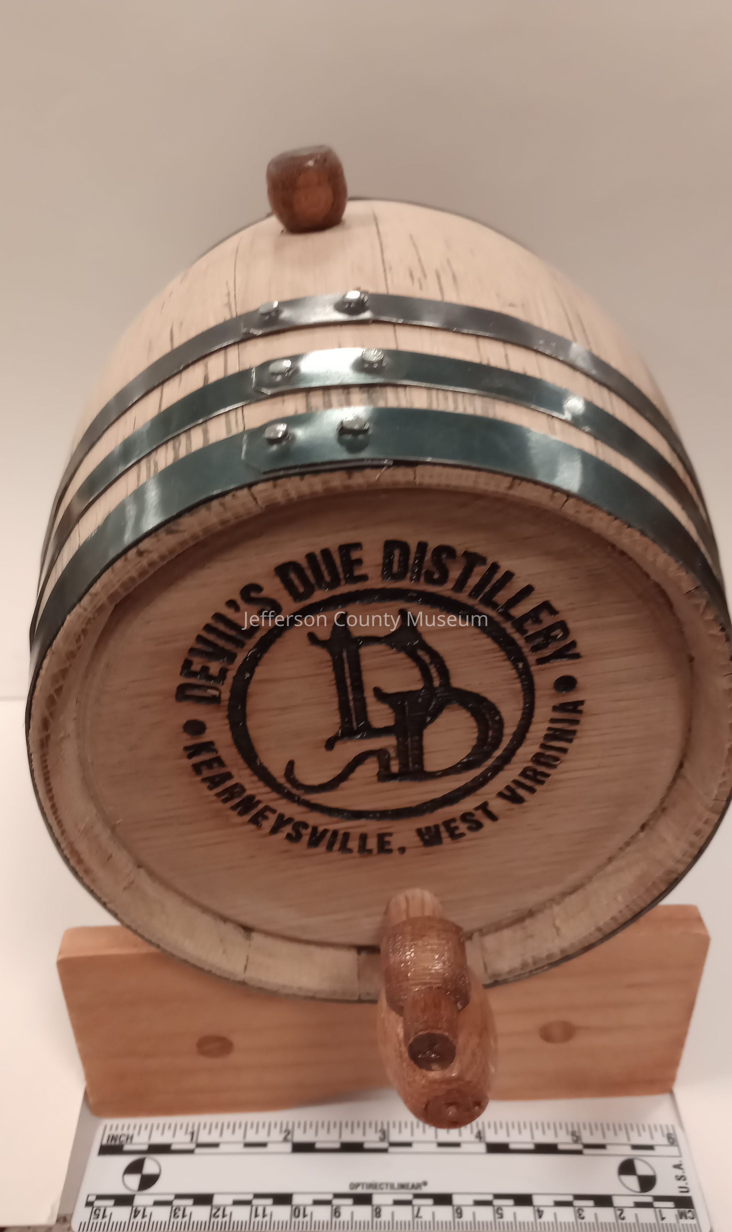 a-barrel for aging and dispensing whiskey with spigot and Devil's Due logo branded into front with cork at top