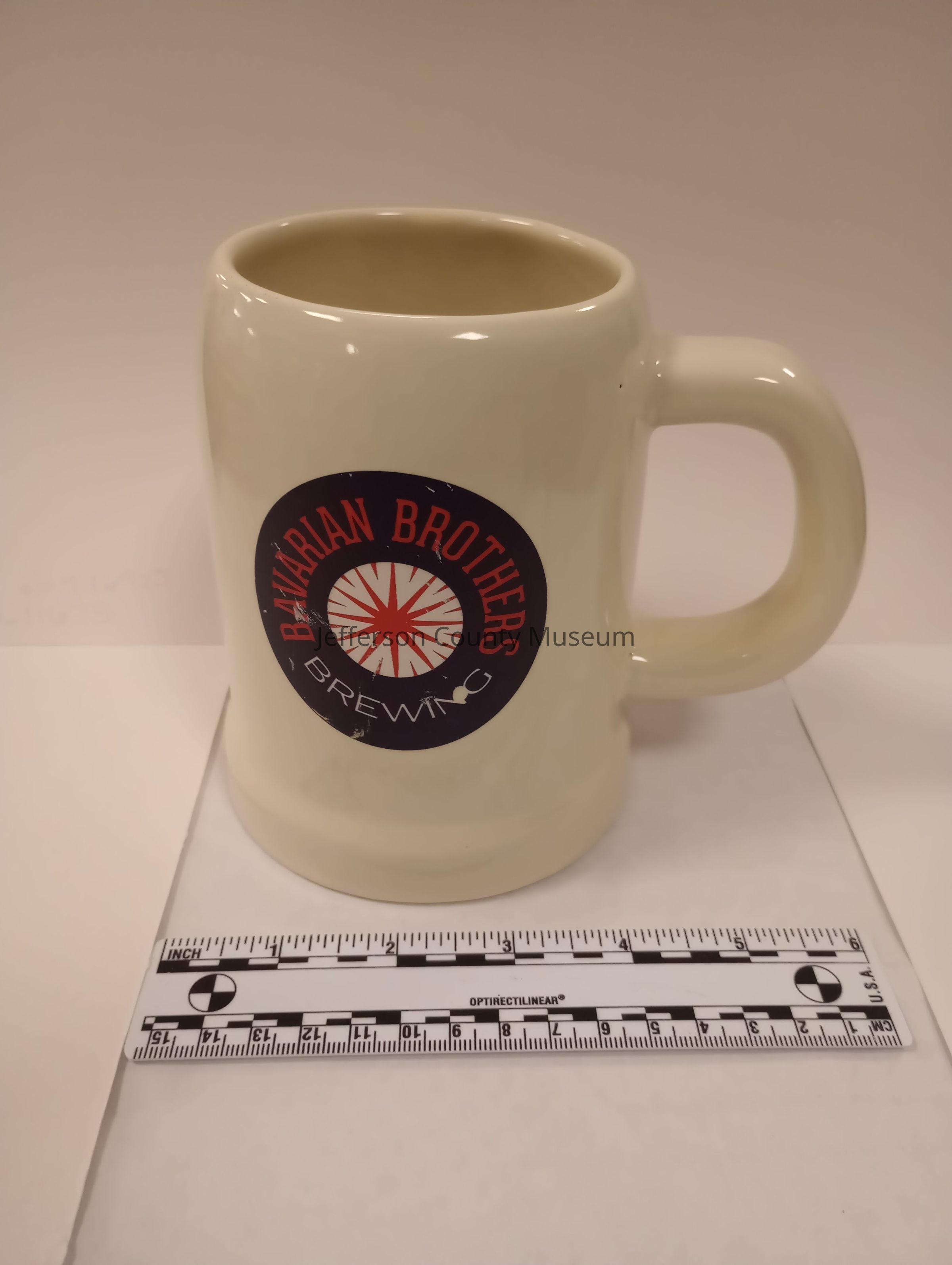Cream colored ceramic mug with Bavarian Bros. Brewing with sunburst logo on either side in blue and orange.Acquisition