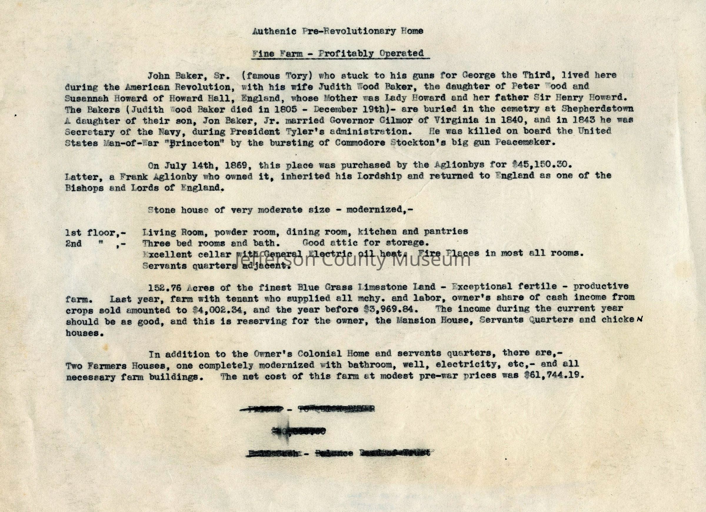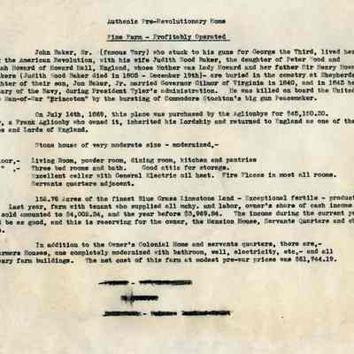 Realtor's description of Gap View Farm. Described as "Authenic [sic] Pre-Revolutionary Home." Includes history of the property, physical description of grounds and dwelling, and "modest pre-war price." Description c. early 1950s. Image stored as a jpeg.Acquisition