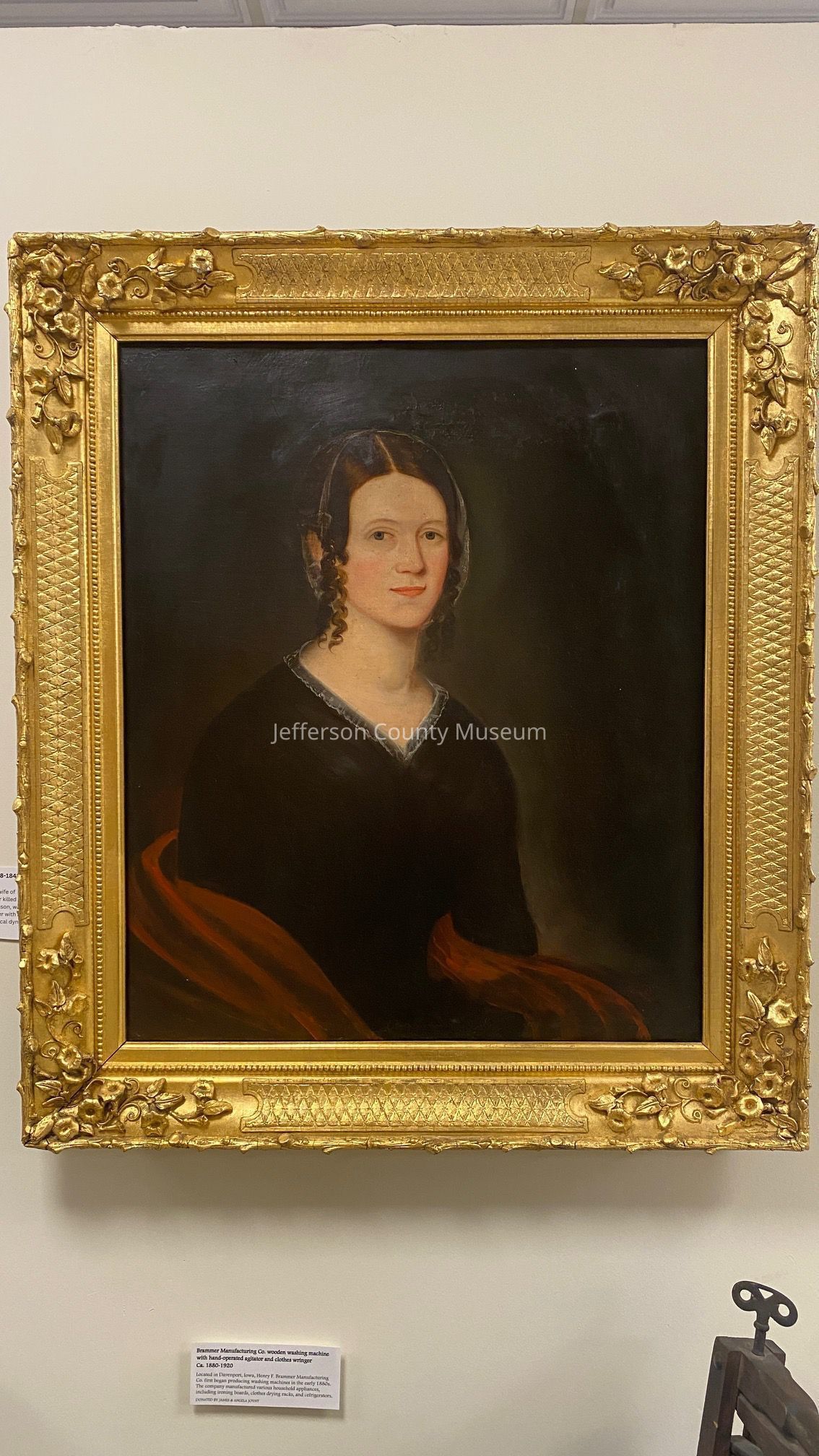 Oil painting of Ann Amelia Stephenson Beckham, wife of Fontaine Beckham. Subject is seated wearing a gauzy cap over curled hair, a black dress with silky collar, and a red shawl. In ornate gold frame.Acquisition