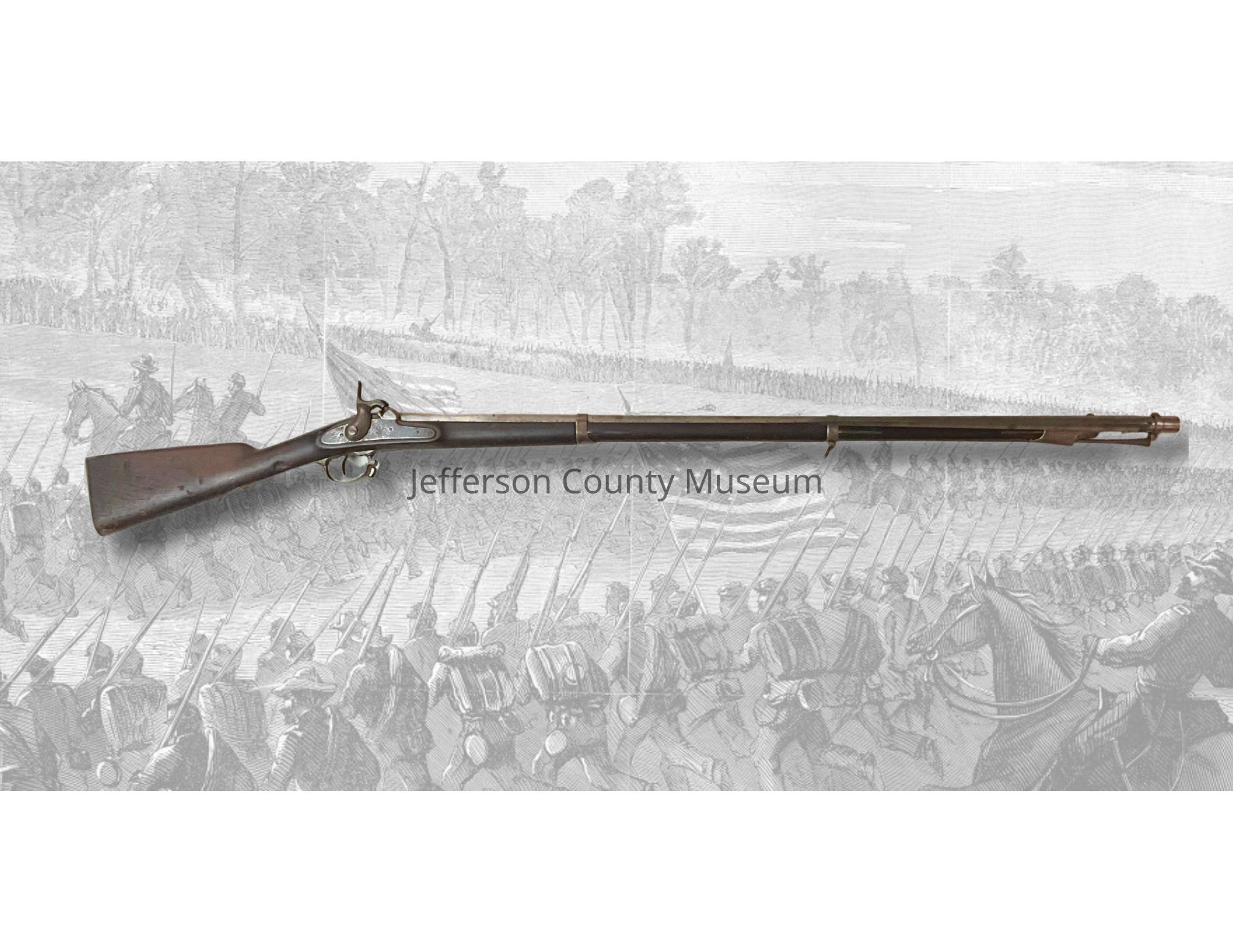 Model 1842 Harpers Ferry .69 caliber percussion musket with bayonet and ramrod. Eagle insignia, 1852 date, and "Harpers Ferry" imprints are visible on metal plates. "W" is carved into the stock.Acquisition