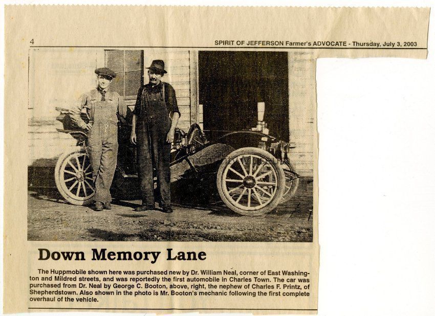 IMG3908037: Huppmobile car, reportedly first automobile in Charles Town, purchased by Dr. William Neal, corner of East Washington and Mildred Streets. On right is George C. Booton, who purchased the automobile from Dr. Neal. On left is Booton's mechanic.