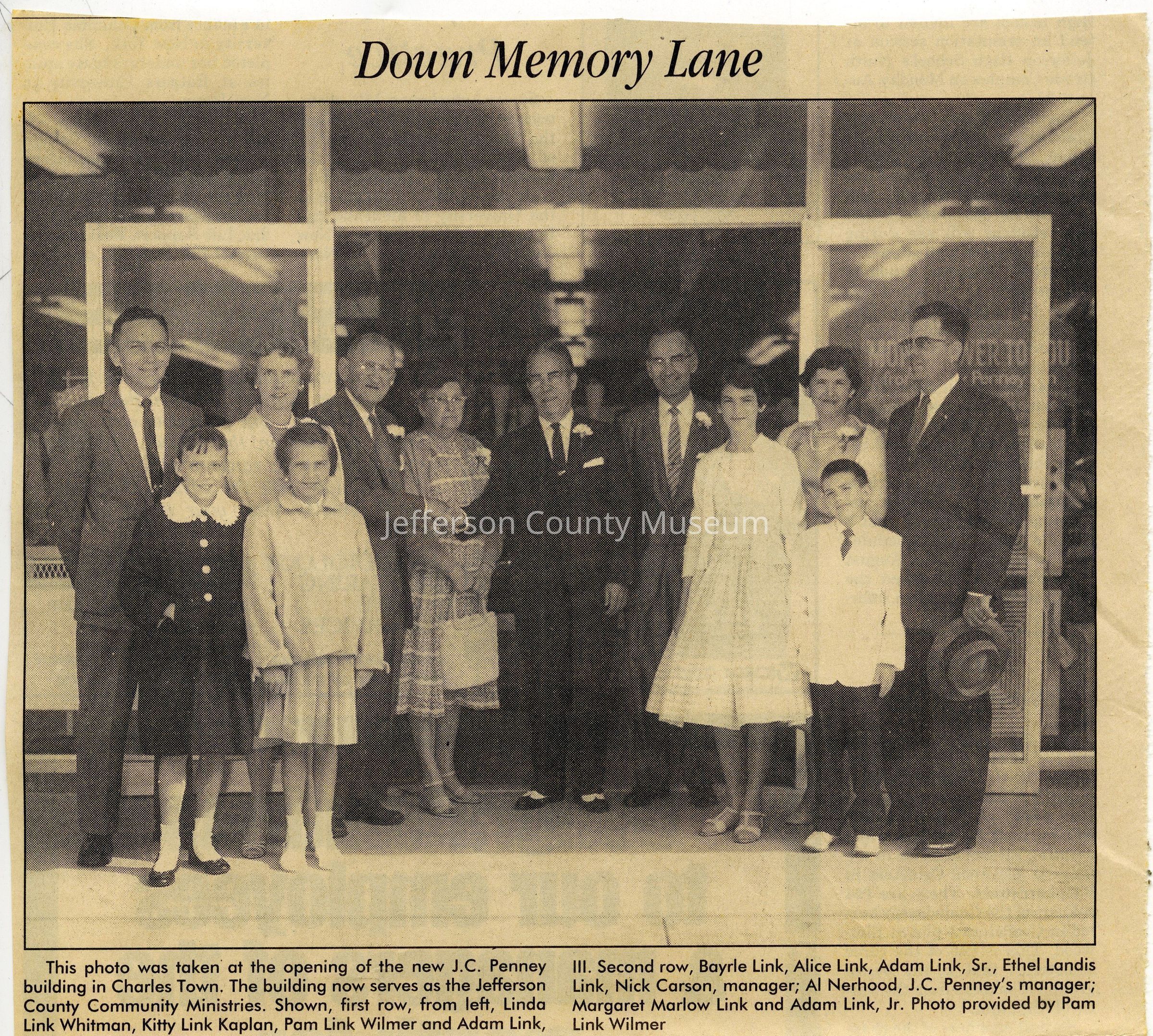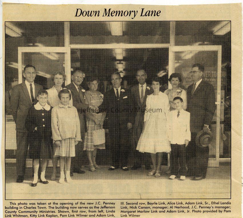 IMG3908038: J. C. Penney store opening, on West Washington Street in Charles Town. First row, from left: Linda Link Whitman; Kitty Link Kaplan; Pam Link Wilmer; Adam Link, III. Second row, from left: Bayrle Link; Alice Link; Adam Link, Sr.; Ethel Landis Link; Nick Carson, manager; Al Nerhood, J. C. Penney's manager; Margaret Marlow Link; Adam Link, Jr.