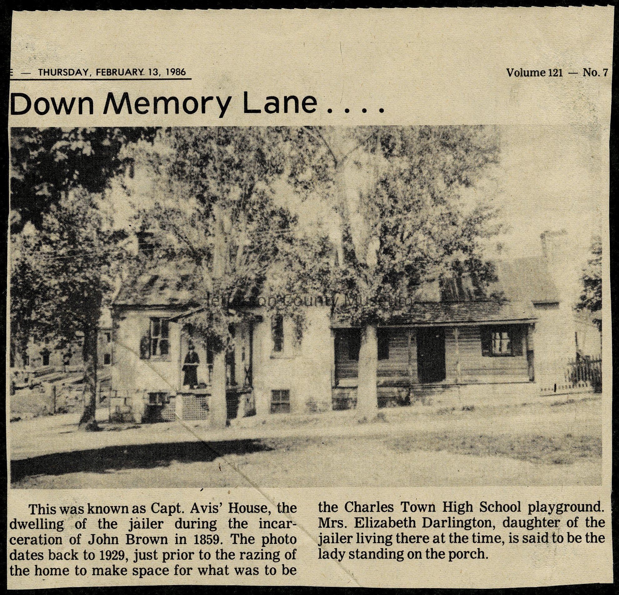 IMG3908022: Captain John Avis' house, in Charles Town, 1929. Avis was the jailer during John Brown's imprisonment. Standing on porch is likely Elizabeth Darlington, John Avis' daughter.