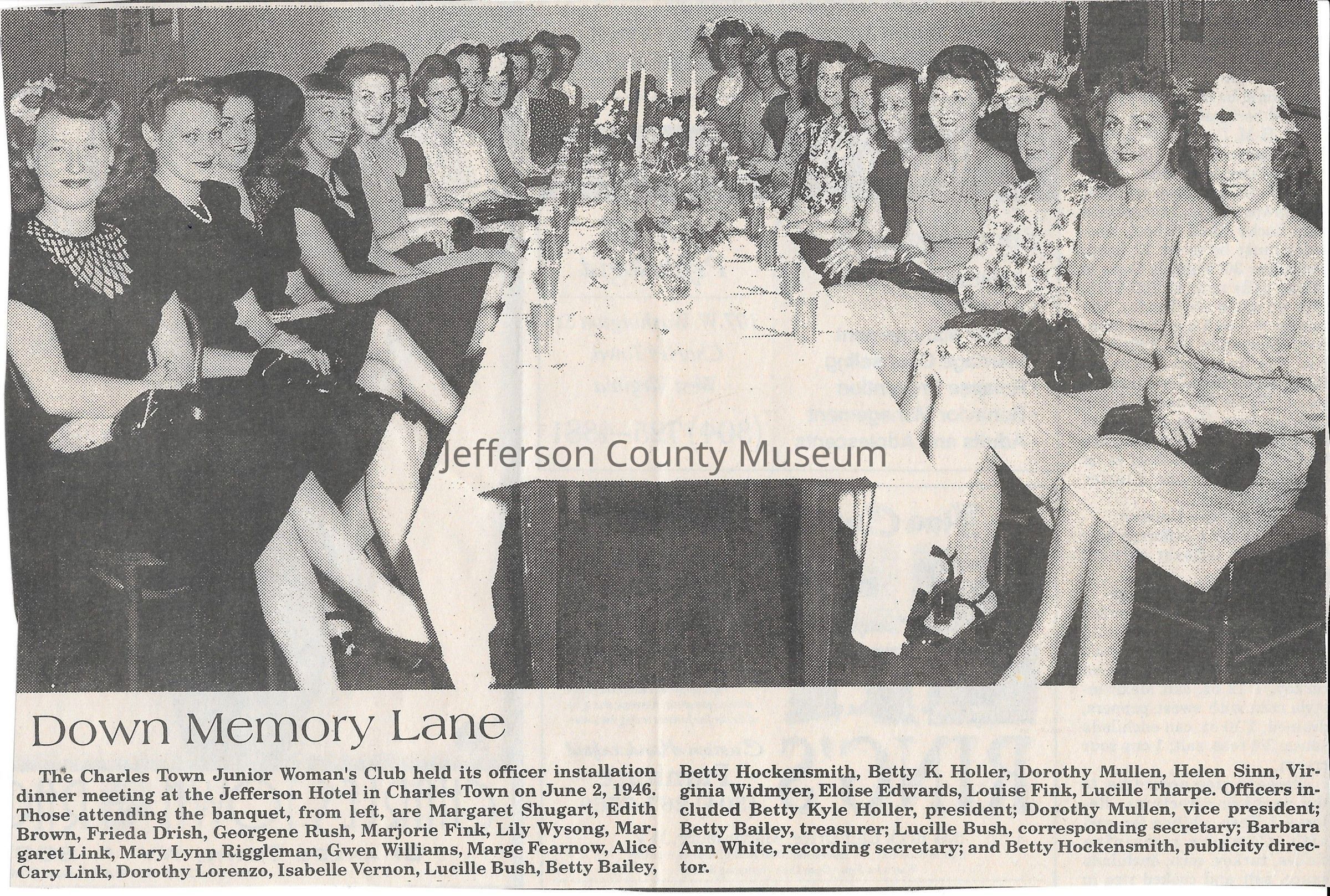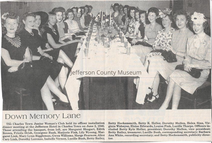 IMG3908040: Charles Town Junior Women's Club, officer installation dinner meeting at the Jefferson Hotel in Charles Town, June 2, 1946. From left: Margaret Shugart; Edith Brown; Frieda Drish; Georgene Rush; Marjorie Fink; Lily Wysong; Margaret Link; Mary Lynn Riggleman; Gwen Williams; Marge Fearnow; Alice Cary Link; Dorothy Lorenzo; Isabelle Vernon; Lucille Bush, corresponding secretary; Betty Bailey, treasurer; Betty Hockensmith, publicity director; Betty Kyle Holler, president; Dorothy Mullen, vice president; Helen Sinn; Virginia Widmyer; Eloise Edwards; Louise Fink; Lucille Tharpe.