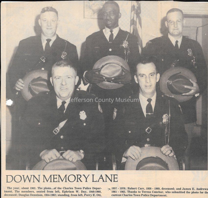 IMG3908042: Charles Town Police Officers, 1962. Front row, from left: Ephraim W. Day, Douglas Dennison. Back row, from left: Perry E. Ott, Robert Carr, James E. Andrews.