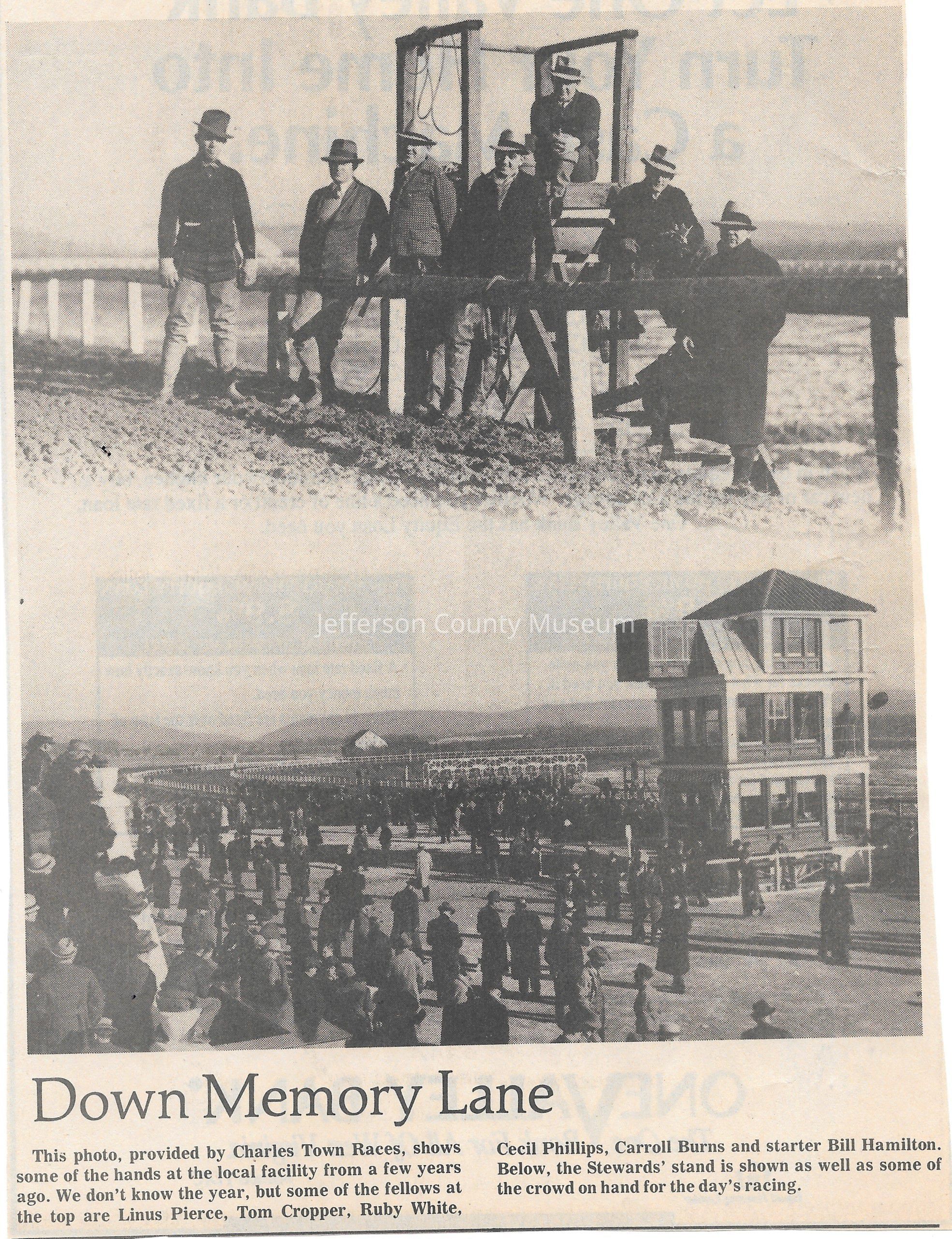 IMG3908043: Top photo: Charles Town Races Starter stand. Individuals shown are: Linus Pierce; Tom Cropper; Ruby White; Cecil Phillips; Carroll Burns; Bill Hamilton, starter. Bottom photo: Charles Town Races Stewards stand and crowd.