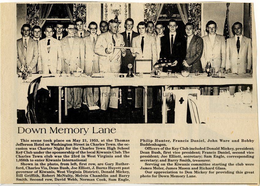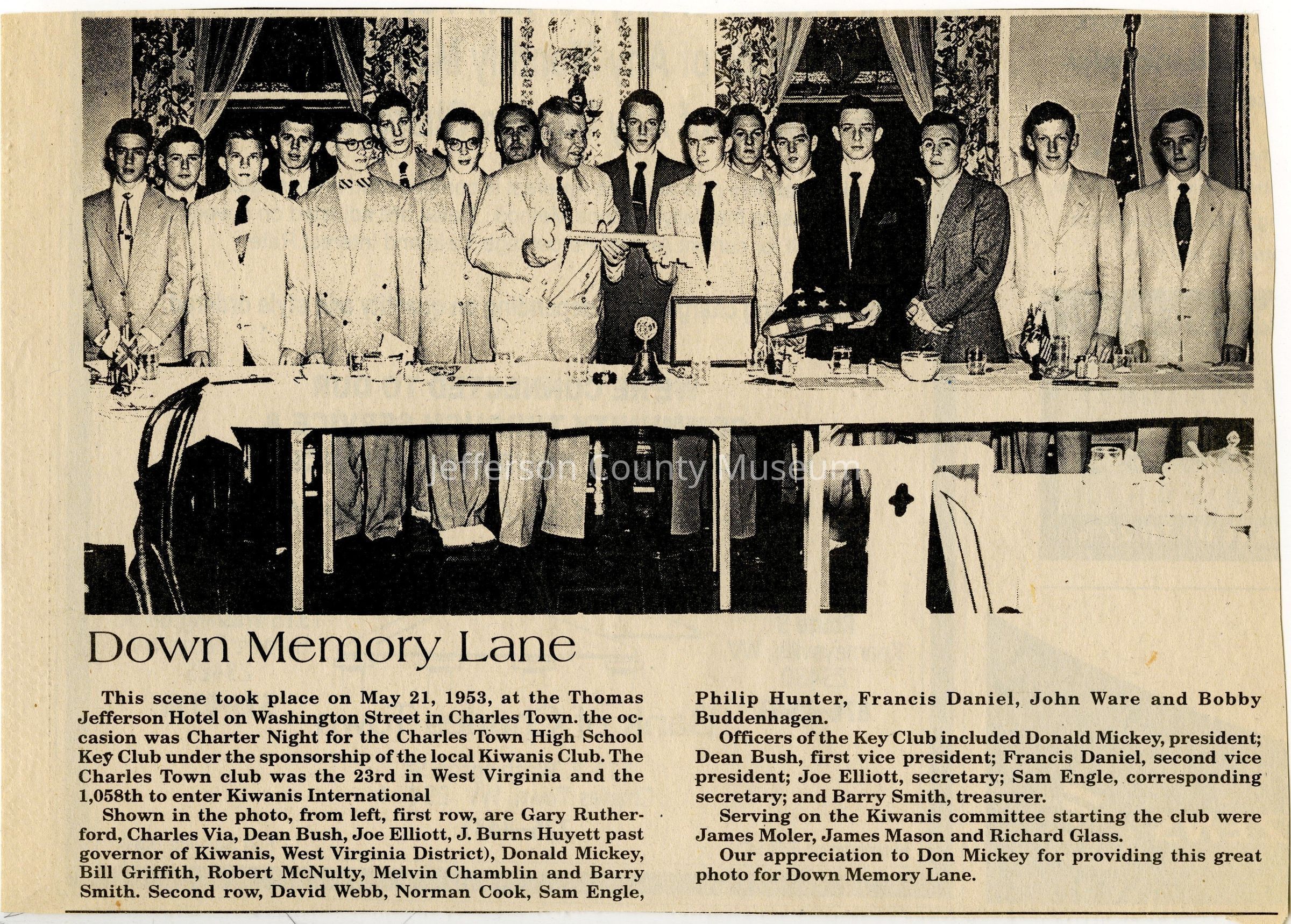 IMG3908044: Charles Town High School Key Club's Charter Night, sponsored by the local Kiwanis Club, at the Thomas Jefferson Hotel on Washington Street in Charles Town, May 21, 1953. First row, from left: Gary Rutherford; Charles Via; Dean Bush, first vice president; Joe Elliott, secretary; J. Burns Huyett, past governor of Kiwanis, West Virginia District; Donald Mickey, president; Bill Griffith; Robert McNulty; Melvin Chamblin; Barry Smith, treasurer. Second row, from left: David Webb; Norman Cook; Sam Engle, corresponding secretary; Philip Hunter; Francis Daniel, second vice president; John Ware; Bobby Buddenhagen.