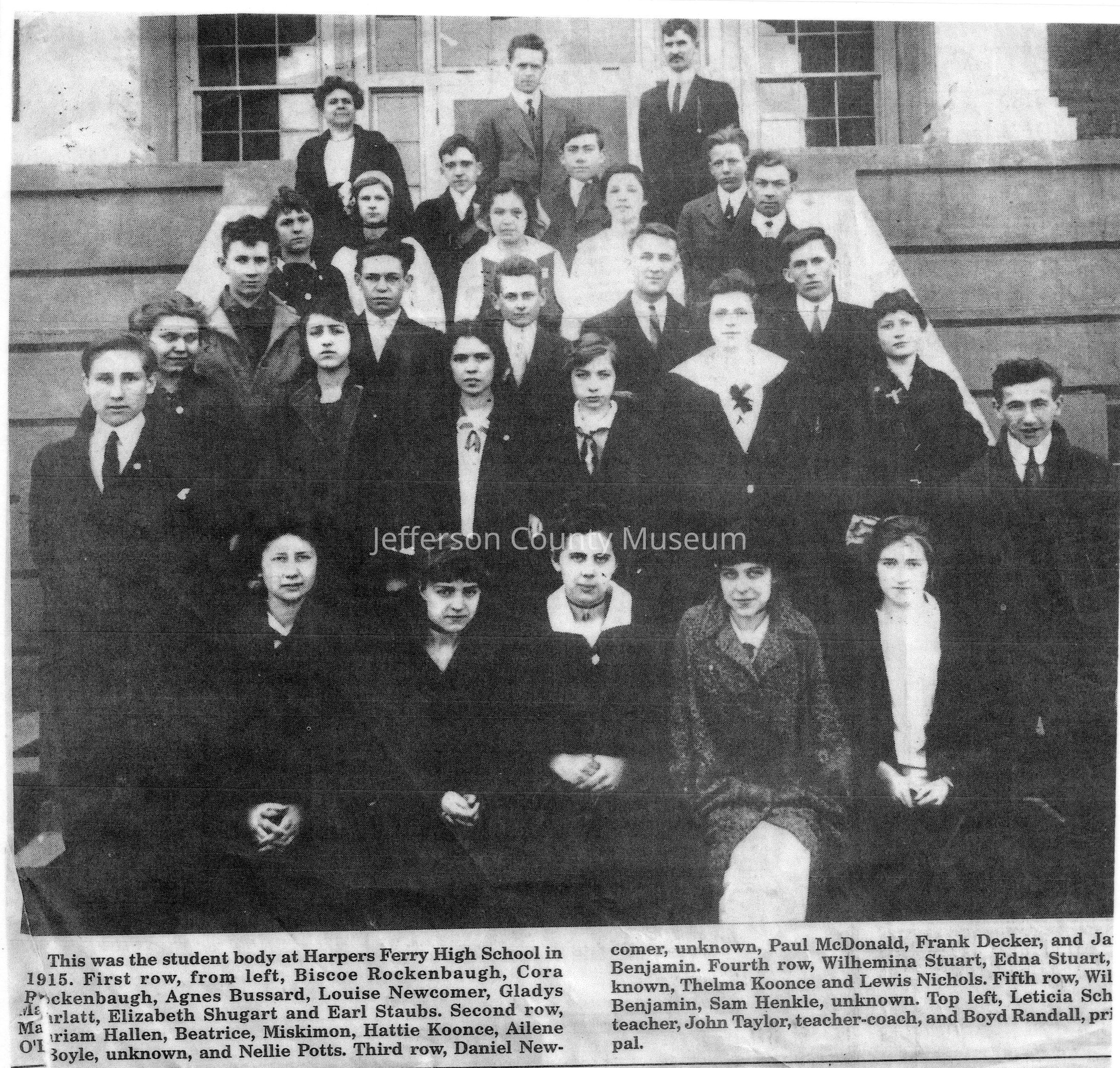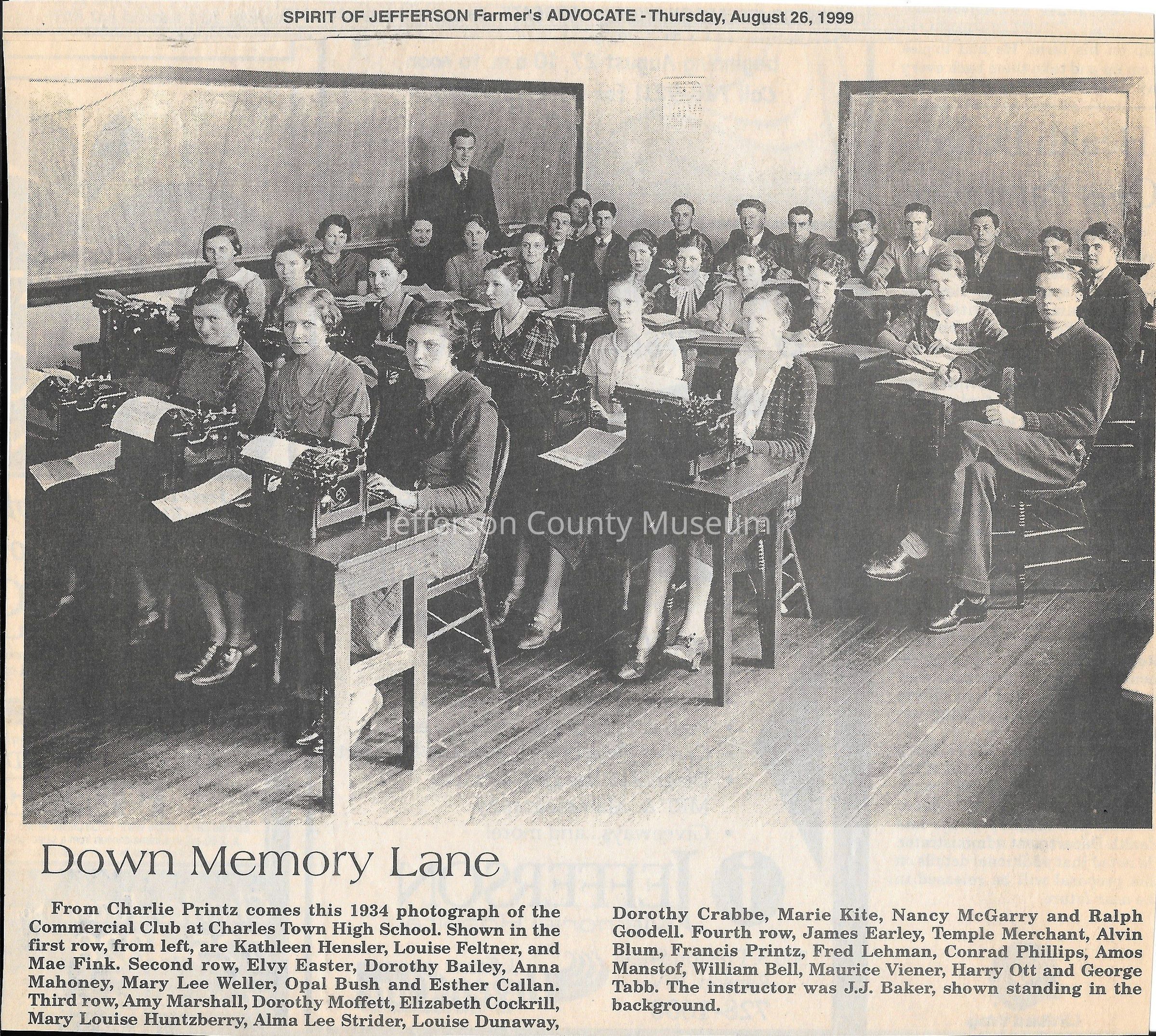 IMG3908025: Commercial Club at Charles Town High School, 1934. First row, from left: Kathleen Hensler, Louise Feltner, Mae Fink. Second row, from left: Elvy Easter, Dorothy Bailey, Anna Mahoney, Mary Lee Weller, Opal Bush, Esther Callan. Third row, from left: Amy Marshall, Dorothy Moffett, Elizabeth Cockrill, Mary Louise Huntzberry, Alma Lee Strider, Louise Dunaway, Dorothy Crabbe, Marie Kite, Nancy McGarry, Ralph Goodell. Fourth row, from left: James Earley, Temple Merchant, Alvin Blum, Francis Printz, Fred Lehman, Conrad Phillips, Amos Manstof, William Bell, Maurice Viener, Harry Ott, George Tabb. Standing in the back is instructor J. J. Baker.