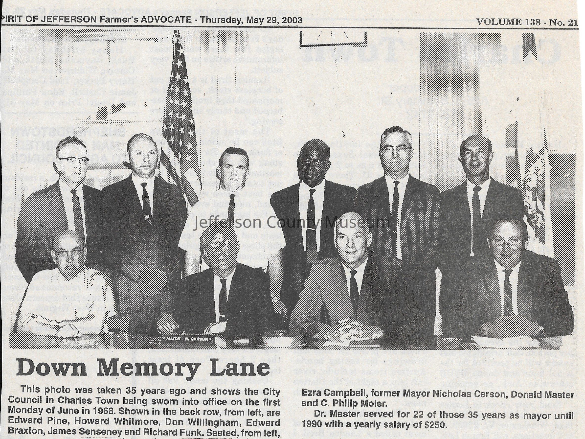 IMG3908046: Charles Town City Council members being sworn into office, June 1968. Back row, from left: Edward Pine, Howard Whitmore, Don Willingham, Edward Braxton, James Senseney, Richard Funk. Front row, from left: Ezra Campbell, Nicholas Carson, Donald Master, C. Philip Moler.