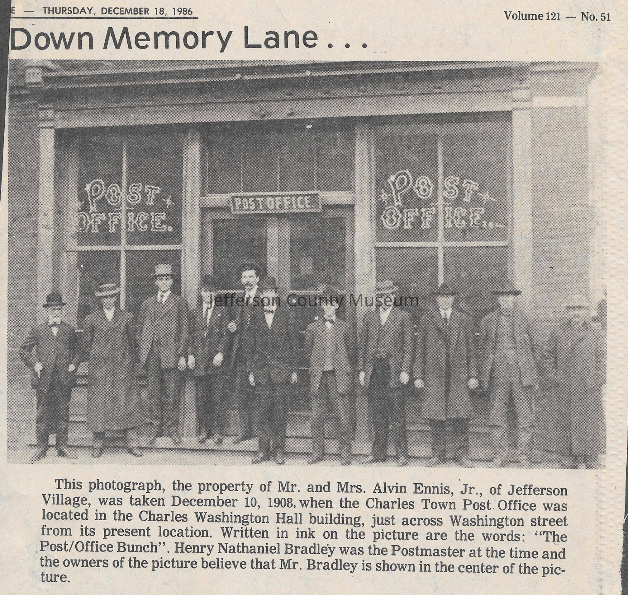 IMG3908047: Individuals in front of Charles Town Post Office, located in Charles Washington Hall, on West Washington Street, December 10, 1908. Henry Nathaniel Bradley was the Postmaster at the time and believed to be in the center of the photograph.