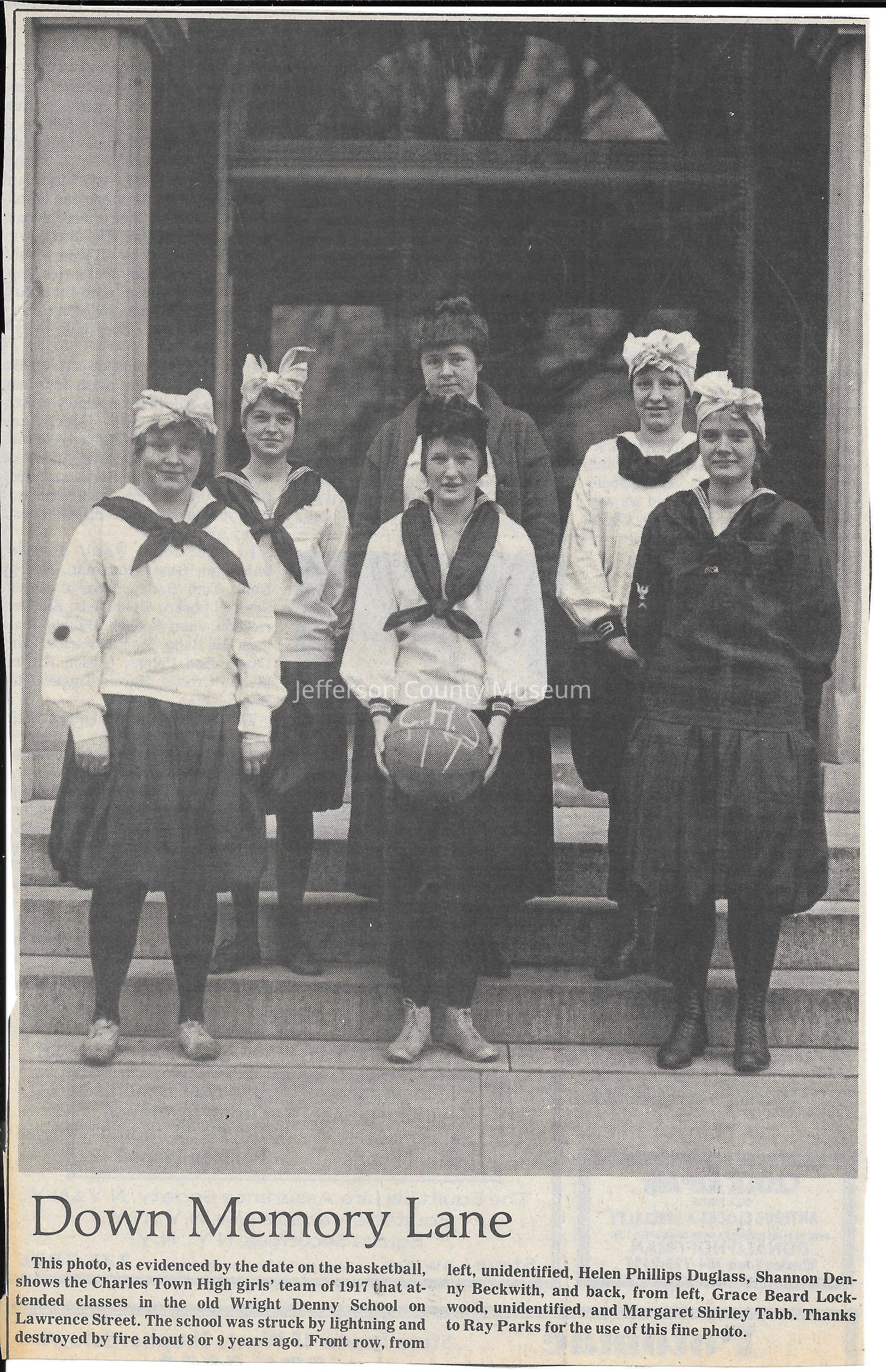 IMG3908026: Charles Town High School girls basketball team, 1917. Front row, from left: unidentified, Helen Phillips Duglass, Shannon Denny Beckwith. Back row, from left: Grace Beard Lockwood, unidentified, Margaret Shirley Tabb.