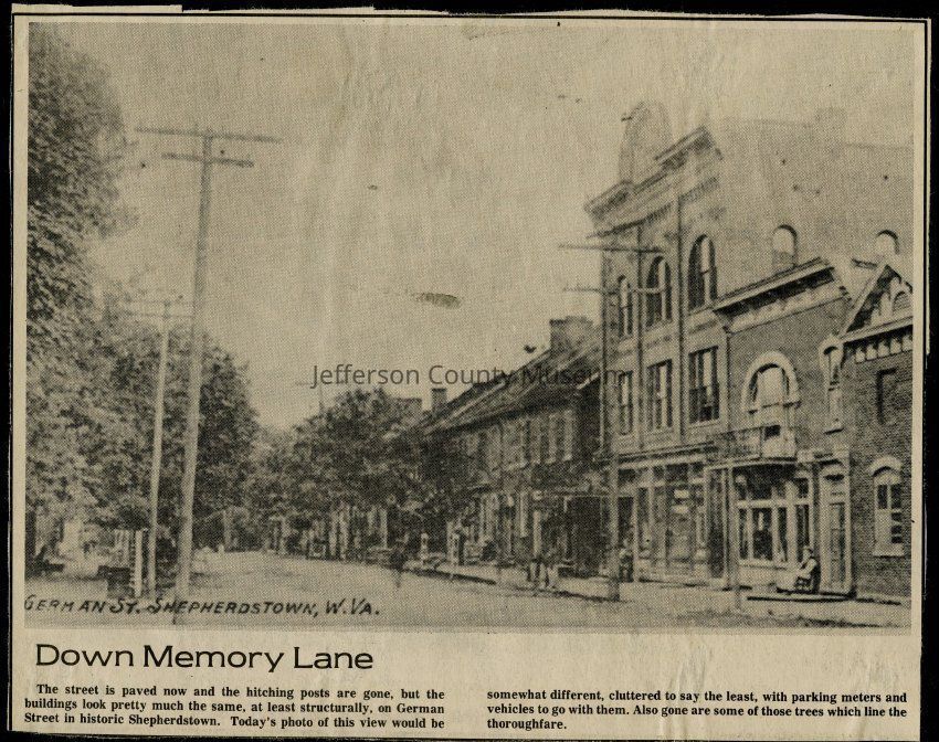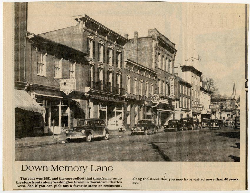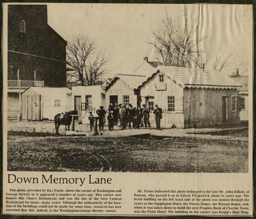 IMG3908051: Corner of Washington and George Streets in Charles Town. The building on the left housed the Sappington Hotel, followed by the Owens House, the Watson House, the Palm Hotel, and then Peoples Bank of Charles Town. The building on the corner was Kemp's Boot Shop.