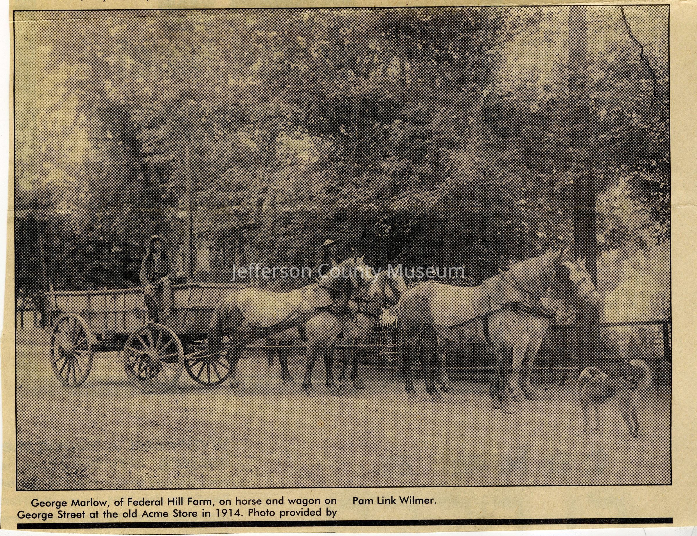 IMG3908029: George Marlow, of Federal Hill Farm, on horse and wagon on George Street at the Acme Store, 1914.