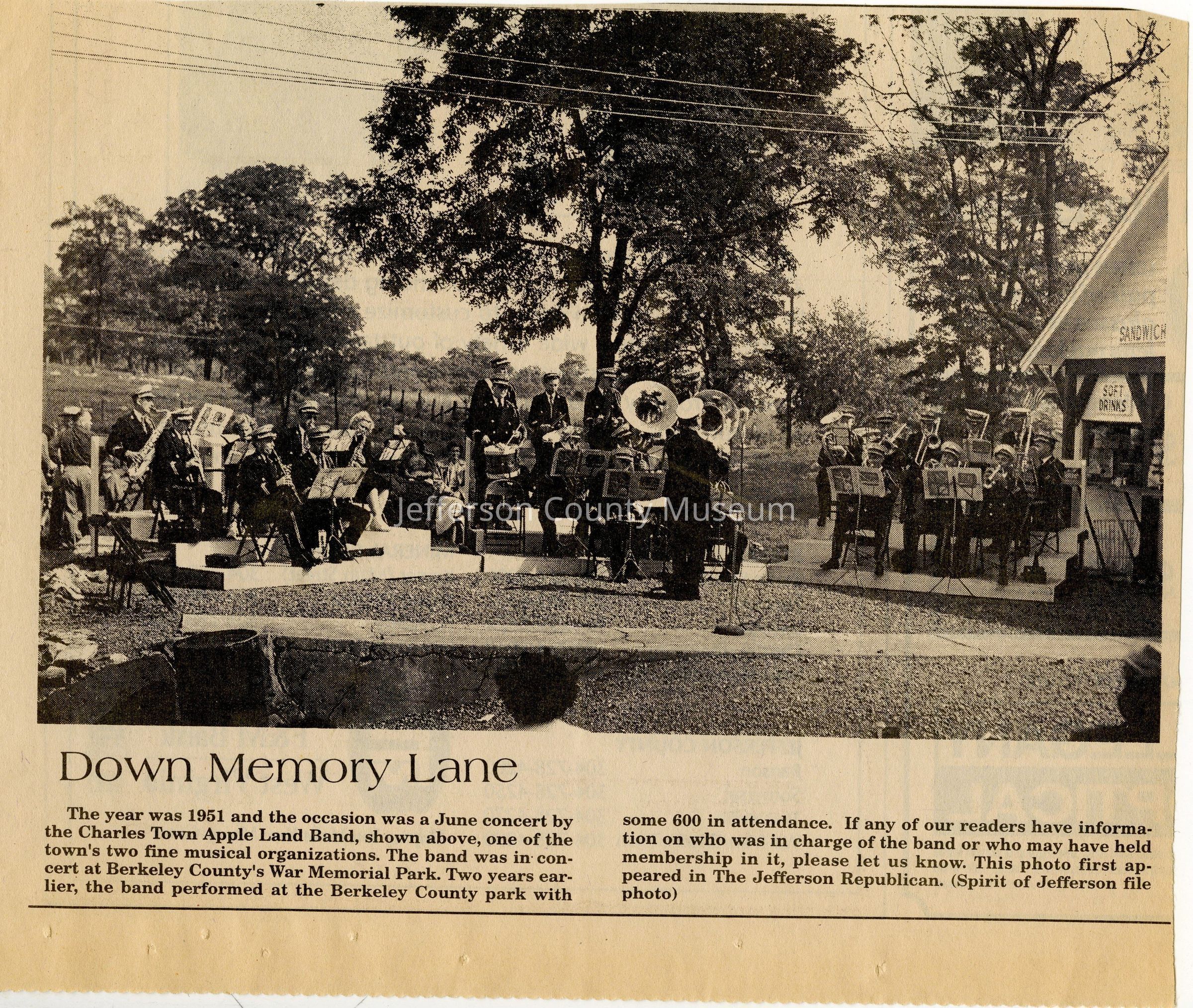 IMG3908030: Charles Town Apple Land Band playing a concert at Berkeley County's War Memorial Park, June 1951.