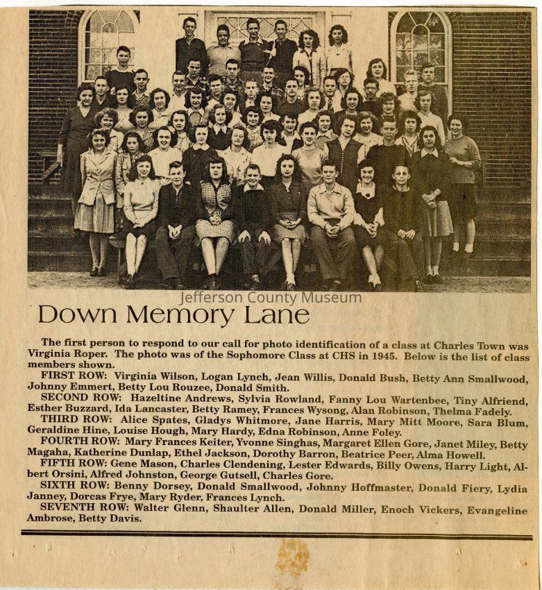 IMG3908057: Charles Town High School sophomore class, 1945. First row, from left: Virginia Wilson, Logan Lynch, Jean Willis, Donald Bush, Betty Ann Smallwood, Johnny Emmert, Betty Lou Rouzee, Donald Smith. Second row, from left: Hazeltine Andrews, Sylvia Rowland, Fanny Lou Wartenbee, Tiny Alfriend, Esther Buzzard, Ida Lancaster, Betty Ramey, Frances Wysong, Alan Robinson, Thelma Fadely. Third row, from left: Alice Spates, Gladys Whitmore, Jane Harris, Mary Mitt Moore, Sara Blum, Geraldine Hine, Louise Hough, Mary Hardy, Edna Robinson, Anne Foley. Fourth row, from left: Mary Frances Keiter, Yvonne Singhas, Margaret Ellen Gore, Janet Miley, Betty Magaha, Katherine Dunlap, Ethel Jackson, Dorothy Barron, Beatrice Peer, Alma Howell. Fifth row, from left: Gene Mason, Charles Clendening, Lester Edwards, Billy Owens, Harry Light, Albert Orsini, Alfred Johnston, George Gutsell, Charles Gore. Sixth row, from left: Benny Dorsey, Donald Smallwood, Johnny Hoffmaster, Donald Fiery, Lydia Janney, Dorcas Frye, Mary Ryder, Frances Lynch. Seventh row, from left: Walter Glenn, Shaulter Allen, Donald Miller, Enoch Vickers, Evangeline Ambrose, Betty Davis.