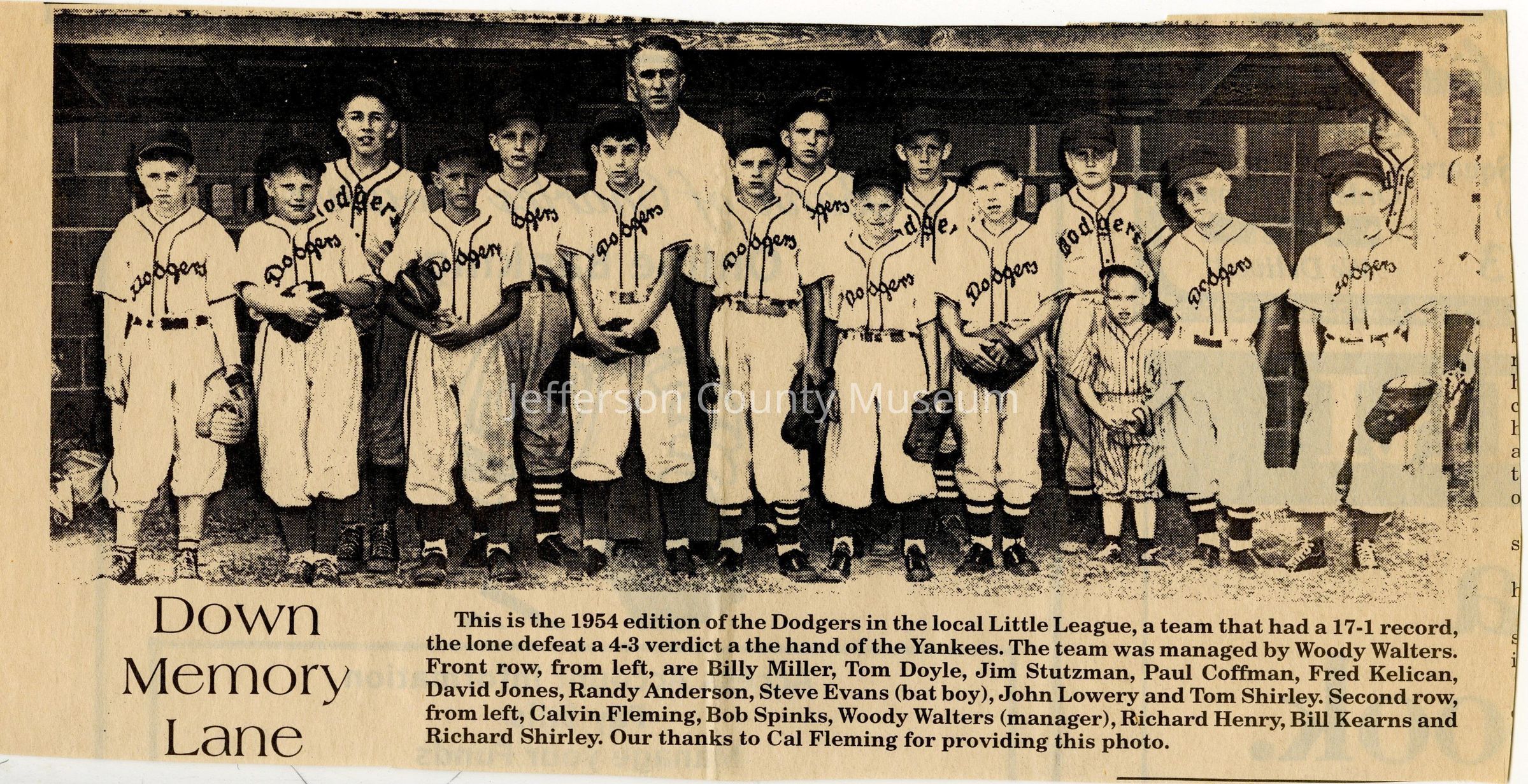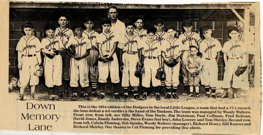 IMG3908059: Little League Dodgers baseball team, 1954. Front row, from left: Billy Miller; Tom Doyle; Jim Stutzman; Paul Coffman; Fred Kelican; David Jones; Randy Anderson; Steve Evans, bat boy; John Lowery; Tom Shirley. Second row, from left: Calvin Fleming; Bob Spinks; Woody Walters, manager; Richard Henry; Bill Kearns; Richard Shirley.