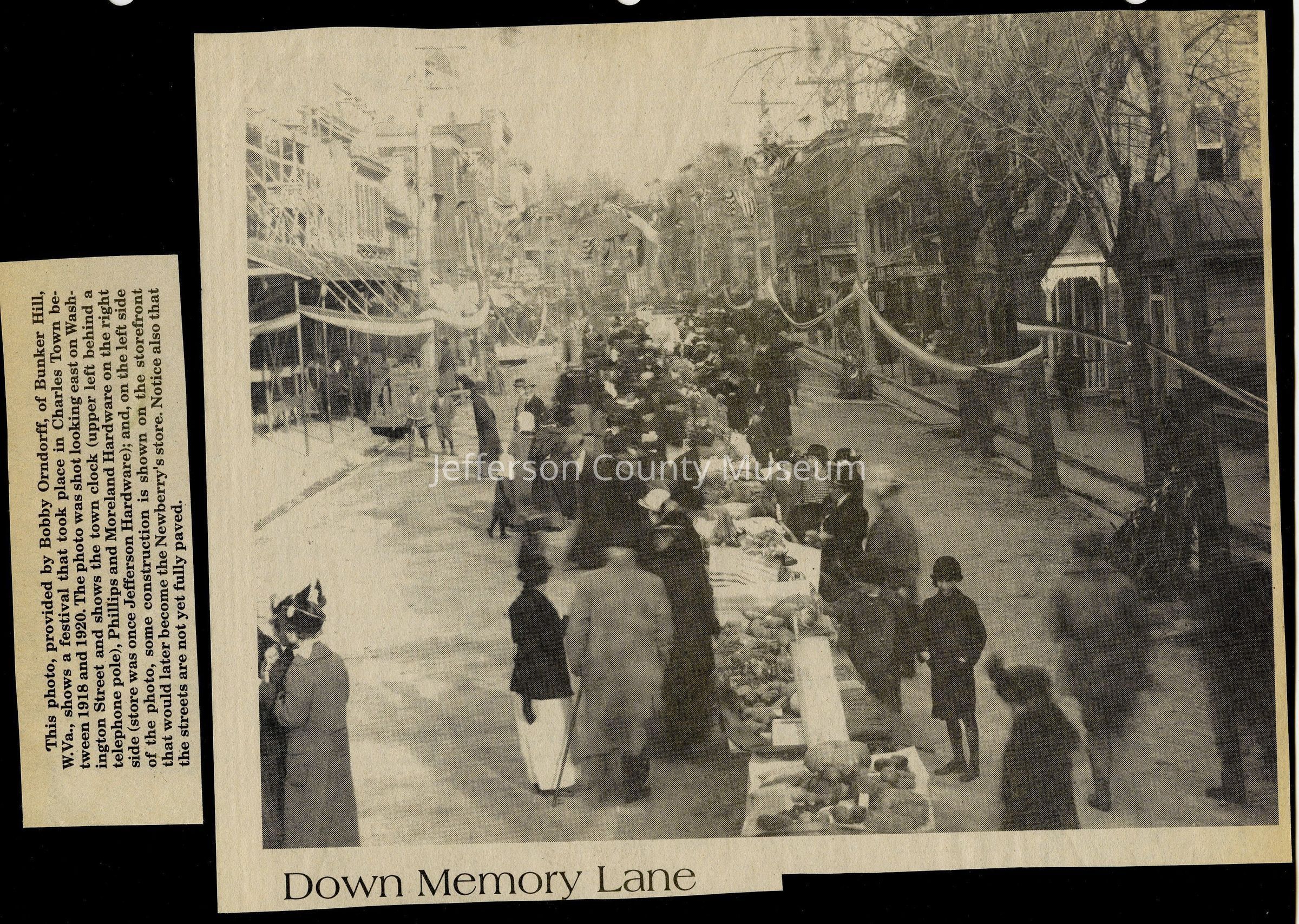 IMG3908033: Charles Town fall festival on Washington Street in Charles Town, circa 1918-1920. Phillips and Moreland Hardware on right side of street. Construction on what would become Newberry's Store on left side of street.