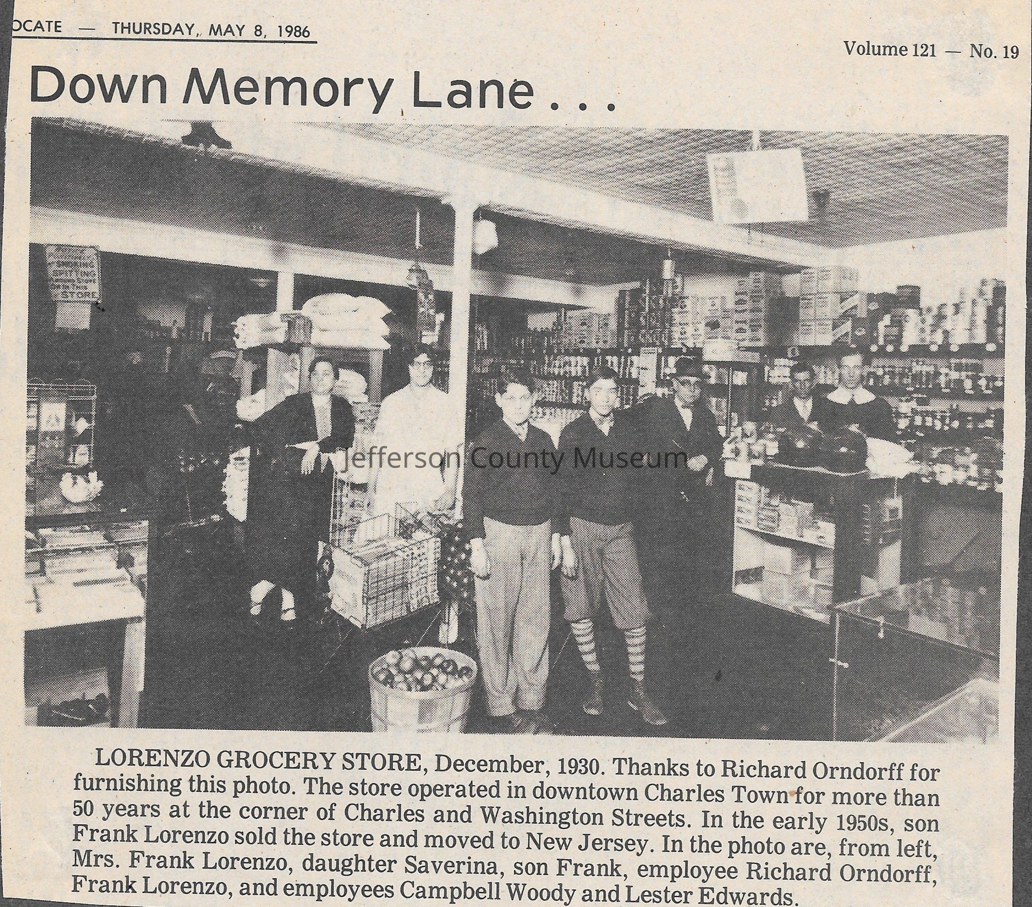 IMG3908064: Lorenzo Grocery Store, located at the corner of Charles and Washington Streets in Charles Town, December 1930. From left: Mrs. Frank Lorenzo; Saverina Lorenzo, daughter of Mr. and Mrs. Frank Lorenzo; Frank Lorenzo, son of Mr. and Mrs. Frank Lorenzo; Richard Orndorff, employee; Frank Lorenzo; Campbell Woody, employee; Lester Edwards, employee.