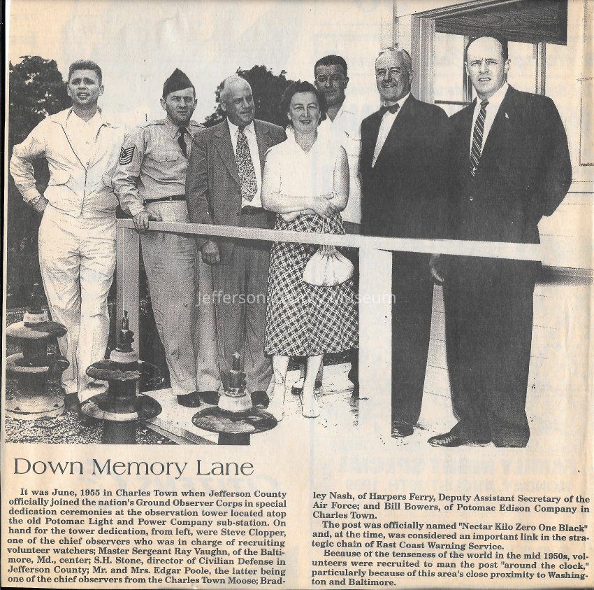 IMG3908065: Ground Observer Corps at special dedication ceremony at the observation tower located atop the Potomac Light and Power Company sub-station, June 1955. Post was officially named "Nectar Kilo Zero One Black." From left: Steve Clopper, chief observer in charge of recruiting volunteer watchers; Master Sergeant Ray Vaughn, of Baltimore, Md.; S. H. Stone, director of Civilian Defense in Jefferson County; Mr. Edgar Poole; Mrs. Edgar Poole, chief observer from the Charles Town Moose; Bradley Nash, of Harpers Ferry, Deputy Assistant Secretary of the Air Force; Bill Bowers, of Potomac Edison Company in Charles Town.