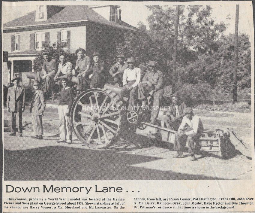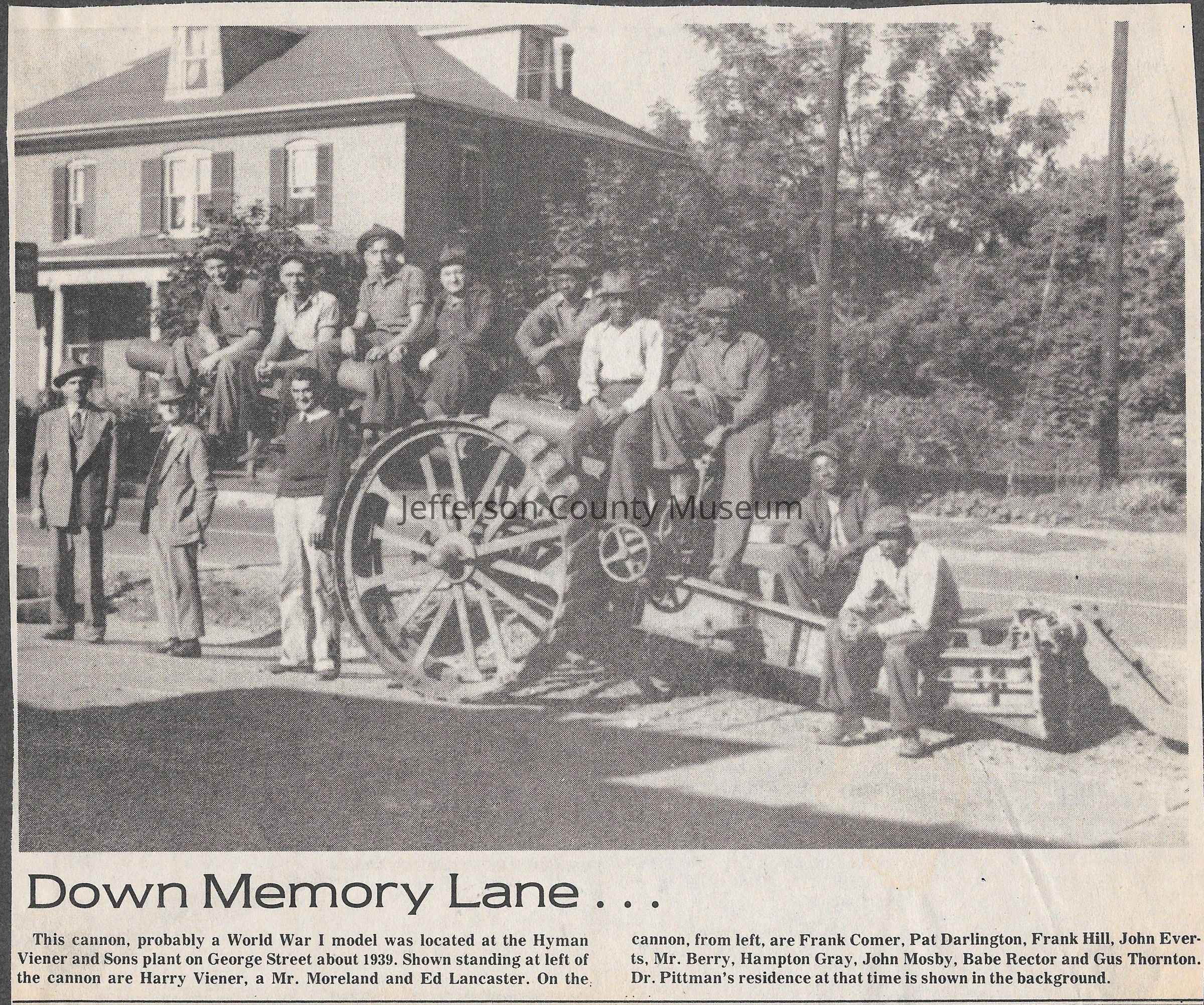 IMG3908072: Canon, likely World War I model, located at the Hyman Viener and Sons, on George Street in Charles Town, circa 1939. Standing, from left: Harry Viener, Mr. Moreland, Ed Lancaster. Sitting on canon, from left: Frank Comer, Pat Darlington, Frank Hill, John Everts, Mr. Berry, Hampton Gray, John Mosby, Babe Rector, Gus Thornton.