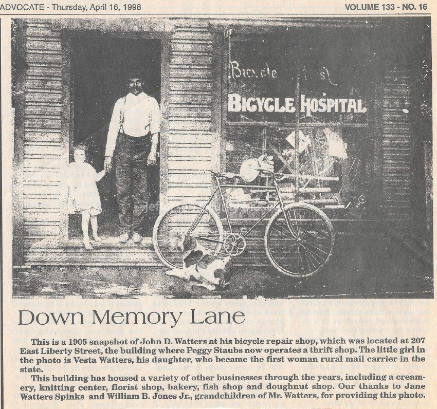 IMG3908078: John D. Watters in front of his bicycle repair shop, located at 207 East Liberty Street, Charles Town, 1905. Young girl holding his hand is Vesta Watters, his daughter.