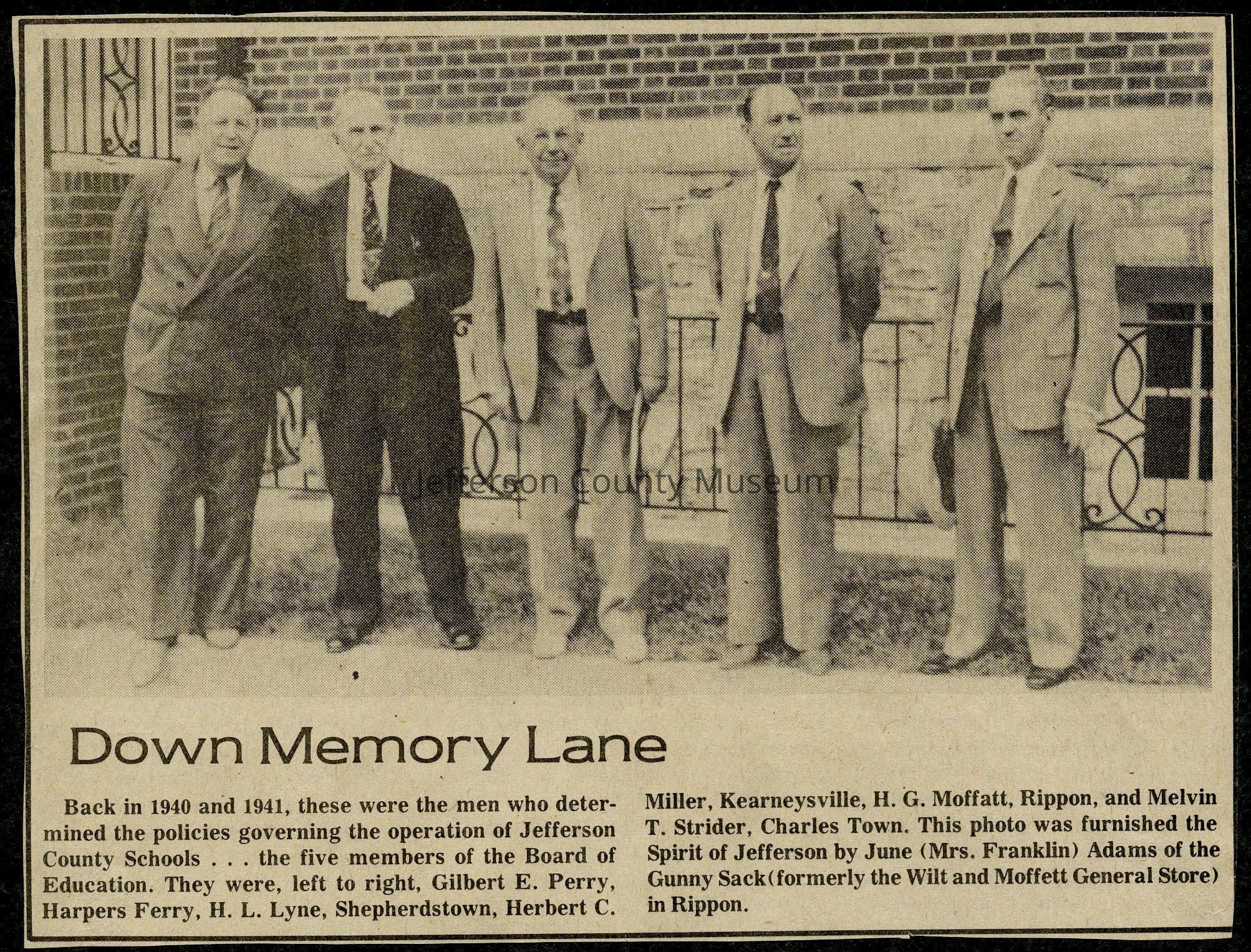 IMG3908079: Jefferson County Board of Education members, 1940-1941. From left: Gilbert E. Perry, Harpers Ferry; H. L. Lyne, Shepherdstown; Herbert C. Miller, Kearneysville; H. G. Moffatt, Rippon; Melvin T. Strider, Charles Town.